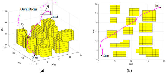 Further analyzing the paths simulated by the APF algorithm, as depicted in Figure 10, the path length generated by the APF algorithm in the workshop is 42.0 m, significantly longer than the results obtained by the other two algorithms. This suggests that the algorithm consumes excessive resources and slows down the search process, (with a runtime of 10.31 s), while the number of path nodes it expands is moderate, (84). Additionally, the planned path becomes excessively long due to the overpowering influence of the obstacles’ repulsive potential field. Furthermore, situations may arise where the attractive and repulsive forces are balanced in magnitude but opposite in direction. This equilibrium can cause the UAV to oscillate locally, resulting in route instability.