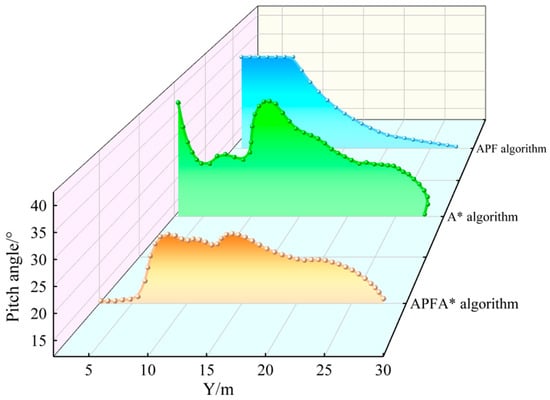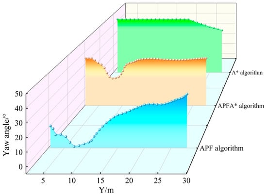 The attitude angle variation in the UAV during flight greatly affects its stability. Therefore, this paper analyzes and compares the attitude angle variation in the UAV along routes planned by various algorithms. Figure 13 and Figure 14 present the yaw angle and pitch angle variations achieved by the three algorithms.