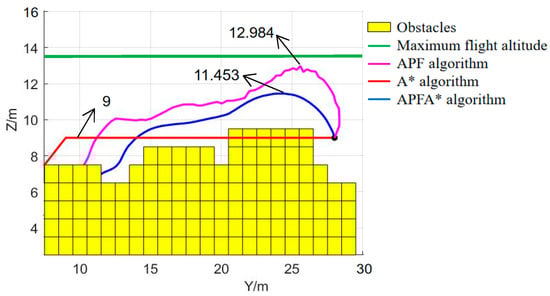 Figure 15 compares the flight altitudes of routes planned by the three algorithms. It can be seen that the highest point of the route planned by the APF algorithm is 12.984 m (3.75 m from Table 6), approaching the altitude limit and posing risks in actual workshops. The route planned by the A* algorithm peaks at 9 m, effectively avoiding obstacles, but its altitude is lower than the highest point of some obstacles, making it susceptible to collisions during actual flight. In contrast, the route planned by the APFA* algorithm peaks at 11.453 m, effectively avoiding obstacles while adhering to the UAV’s maximum flight constraint, thereby achieving ideal results and further demonstrating the algorithm’s reliability.