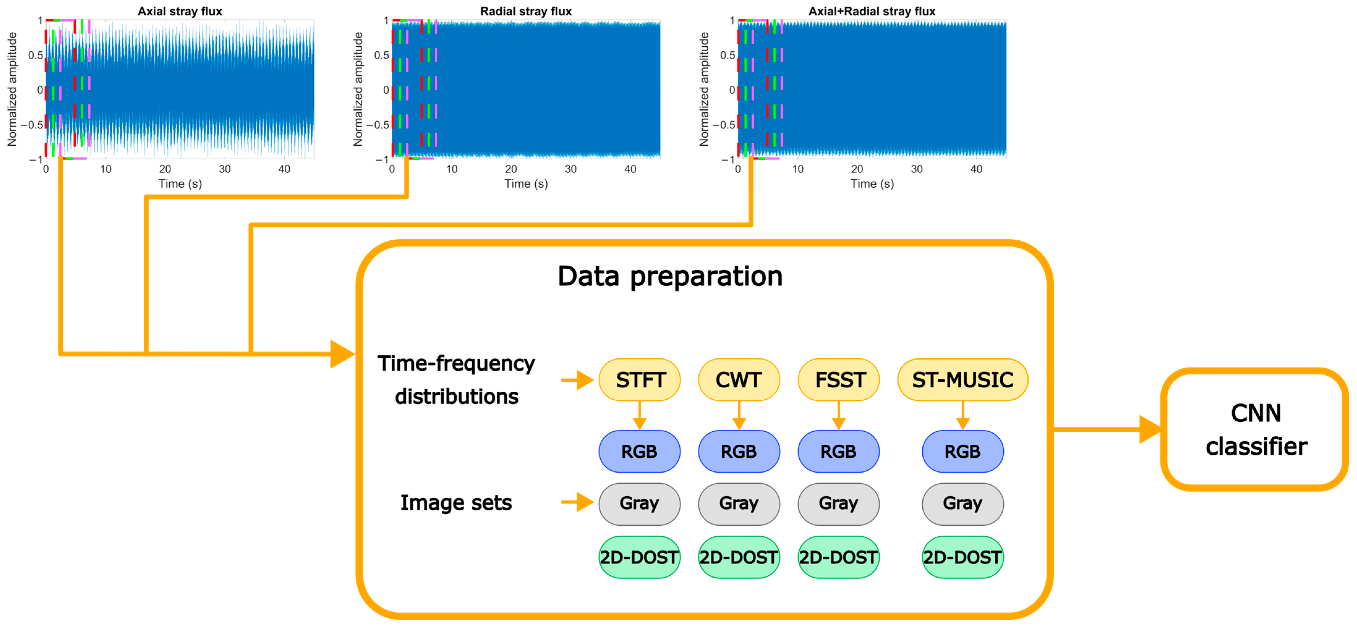 30], the authors explored the use of the 2D-DOST on STFT and CWT images from stray flux signals for the diagnosis of bearing faults in an IM with a lightweight CNN model, identifying an improvement in accuracy when applying the 2D-DOST to the grayscale CWT images, while the opposite was observed on the STFT dataset. In this paper, a continuation of the previous work is carried out, proposing a methodology where stray flux signals are analyzed using the STFT, CWT, FSST and ST-MUSIC to generate TFDs, which are then saved in RGB, grayscale and a third set processed with the 2D-DOST for the diagnosis of one healthy and eleven faulty conditions including bearing faults, various severities of BRBs, unbalances, misalignments and a loosened bolt. The results compare the performance on several configurations of TFDs and image types, including training times, accuracy, and the effect of processing tools on the inputs of a lightweight CNN model. With these results, the proposed method presents an alternative to improve the classification accuracy of a small CNN model for multiple fault diagnosis considering the use of various TFDs by employing a texture analysis tool as a preprocessing step in the analysis of stray flux signals using non-invasive sensors.