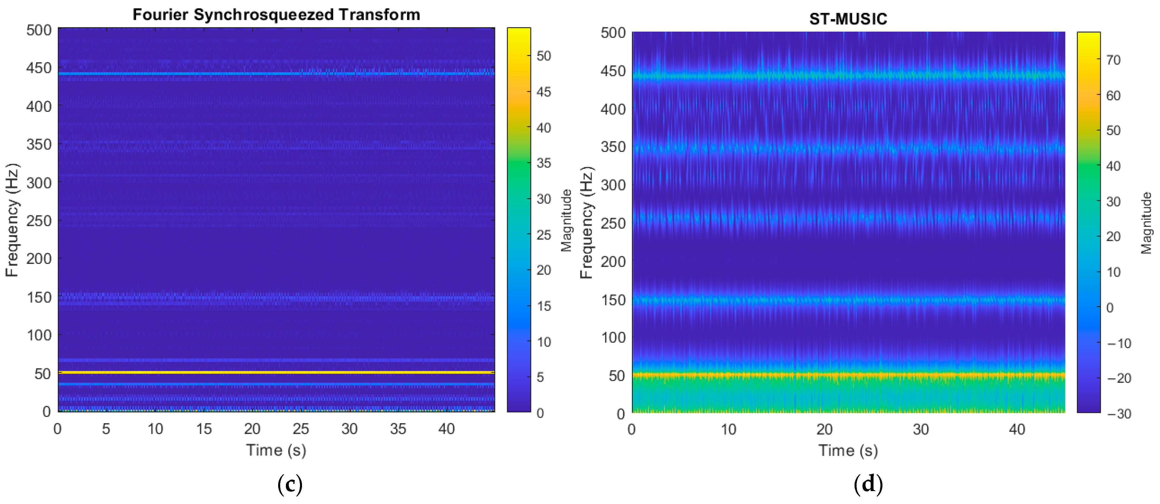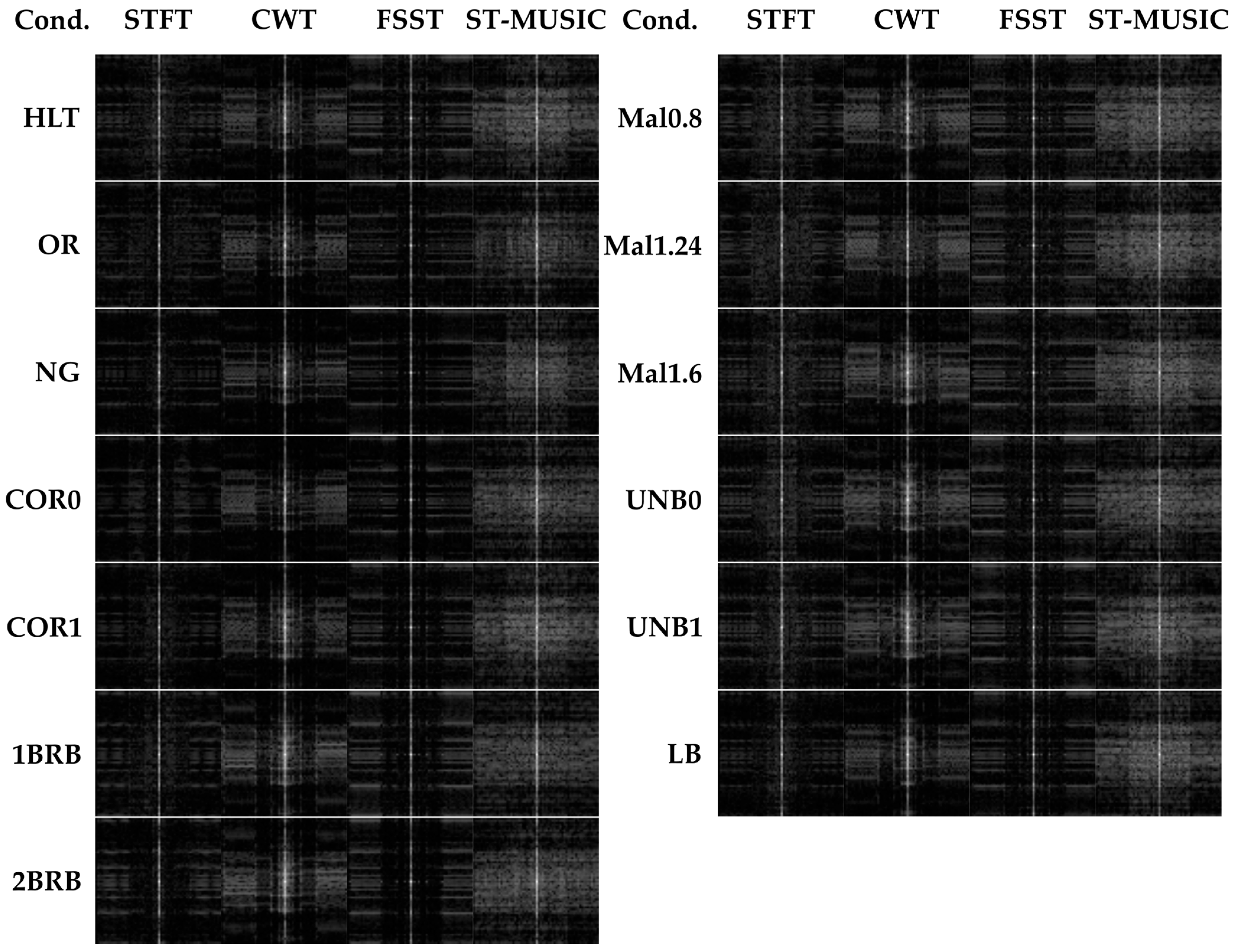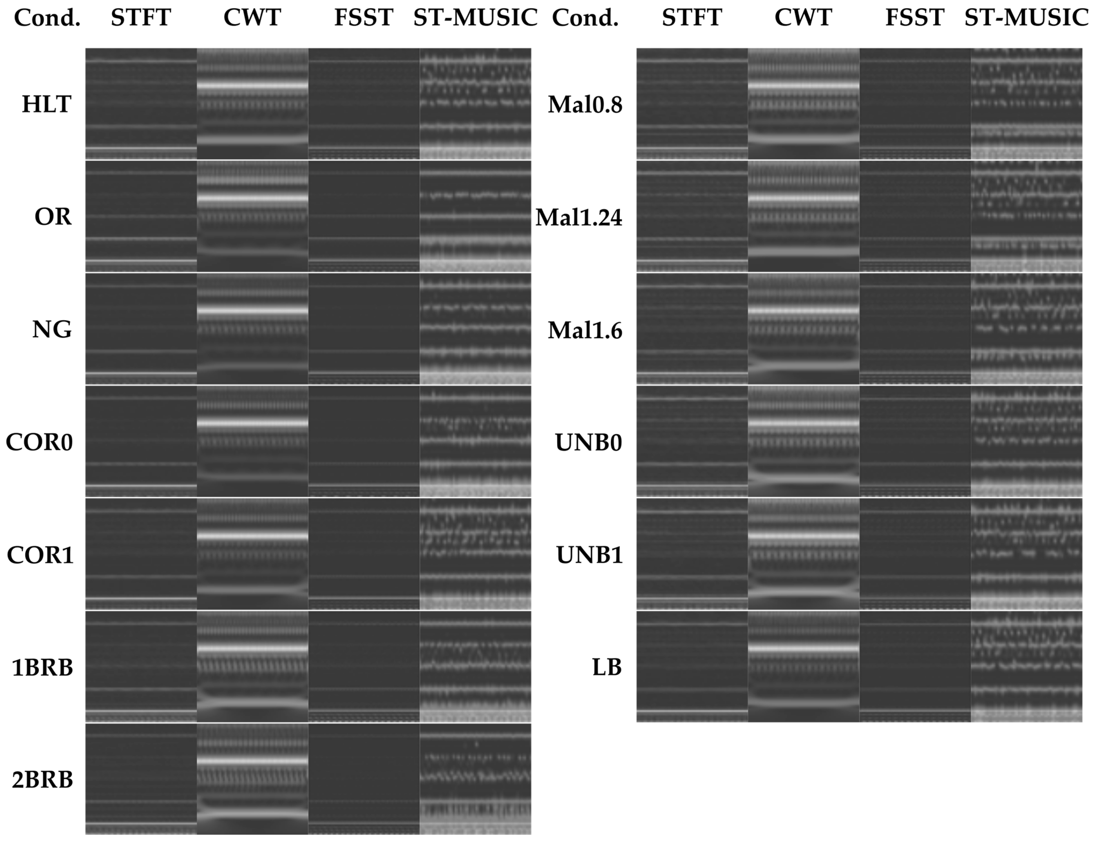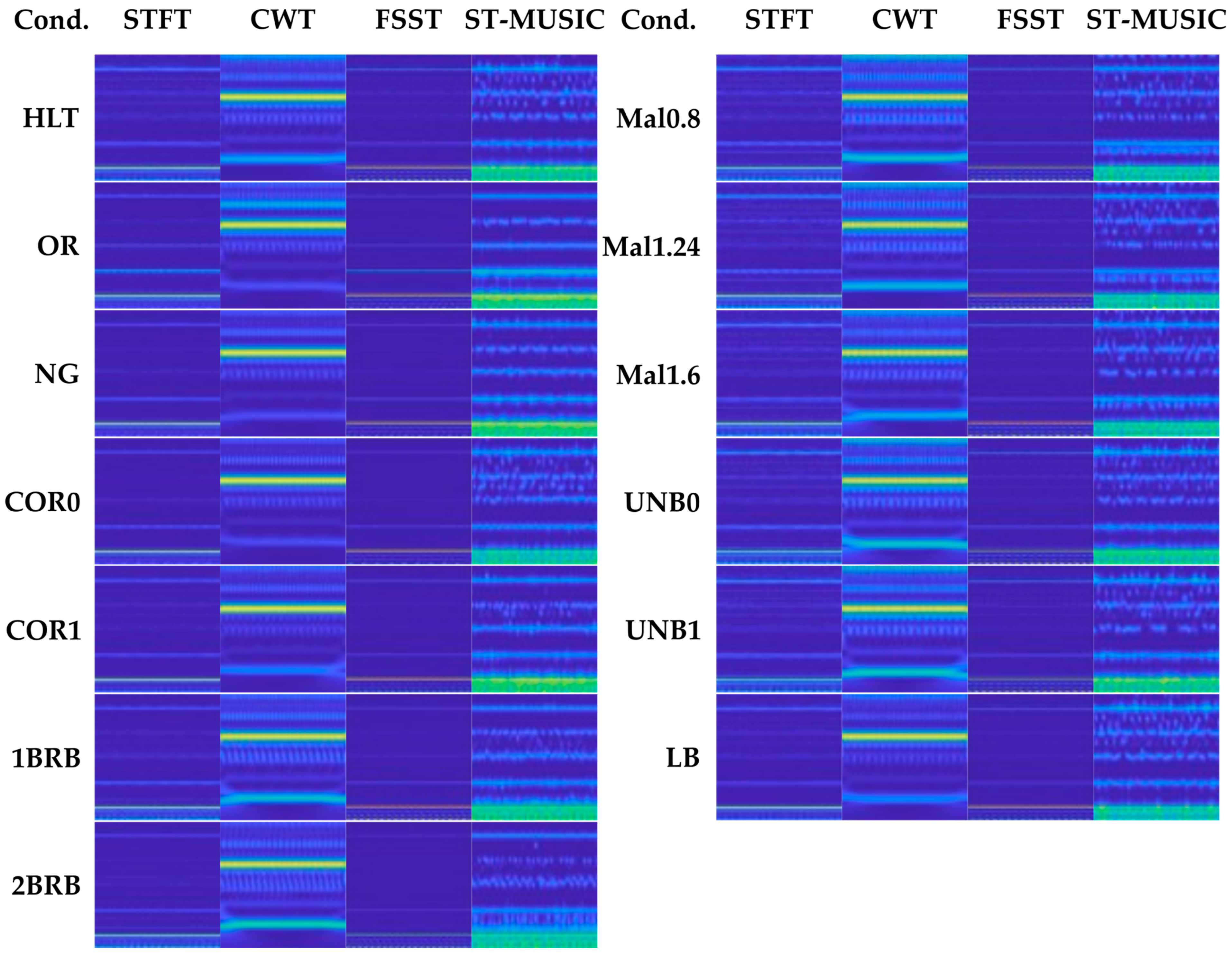 21] presented a comparison of four TFDs for the diagnosis of a BRB, imbalance, and bearing defects using vibration signals, offering an analysis of the way these TFDs display the information and concluding that the ST-MUSIC gives more detailed information about the components related to the faults under study. In [