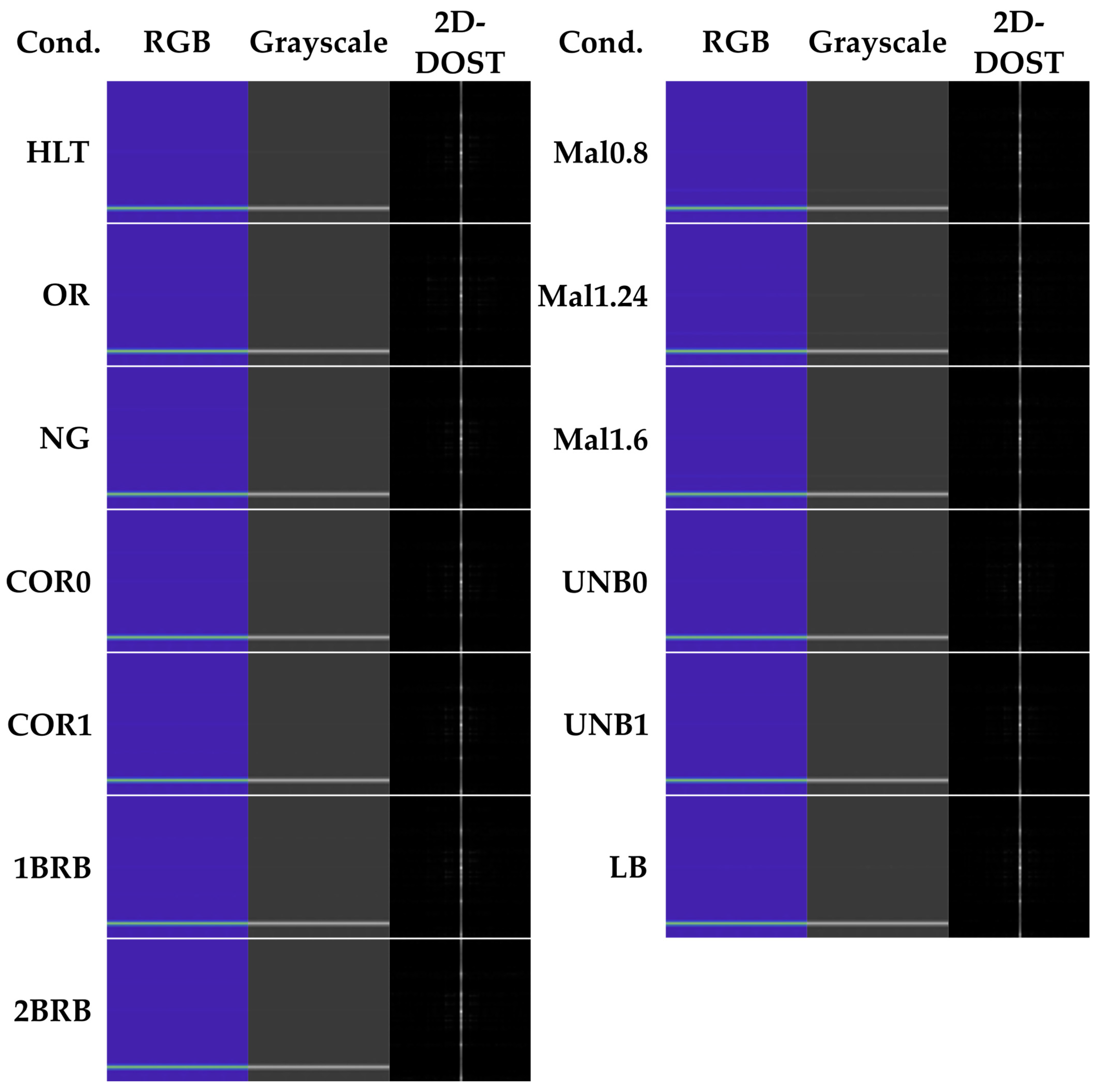 Table 9, RGB images reached high results in condition classification in most cases while the use of grayscale pictures represented a reduction in the performance of the model, possibly related to the lower detailed and information, as those images have information of the three color layers (RGB) condensed in one; contrarily, the results when using the 2D-DOST processed datasets showed an improvement over the RGB sets, this could be caused by the distribution of the information performed by the DOST, which could facilitate the extraction of features performed by the CNN model.