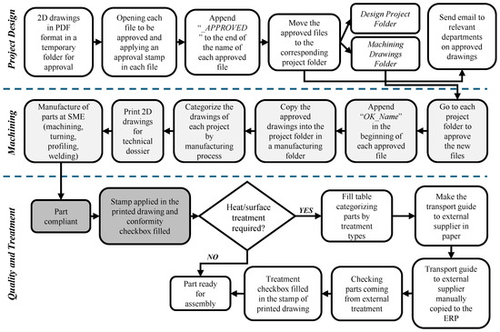 ERP systems are generally designed to be highly customizable, allowing them to adapt to the specific workflows and operational requirements of different organizations, a crucial role in integrating business functions and improving efficiency. Still, despite their recognized potential in industrial settings, some ERP systems are often unable to address specific demands of project-based manufacturing and production workflows, given that they are generally designed for administrative and financial management, rather than engineering and production. In these cases, tailored digital tools are required to maintain the growing demands for efficiency, traceability, and precision [11,12,13,30]. This was precisely the case of the SME reported in this study, which specializes in the design and manufacturing of industrial mechanical components and systems. Although being equipped with a robust ERP platform (PHC) for overall business management, this SME’s system lacked the necessary automation capabilities to efficiently handle technical project approvals, manage design iterations, and track production workflows on the shopfloor. Indeed, tasks such as manual validation of technical drawings, renaming files, organizing them into designated folders, and notifying relevant departments via email created production bottlenecks, which reduced productivity and introduced risks of error or data inconsistency. A workflow of the process prior to the GIP implementation is detailed in Figure 1.