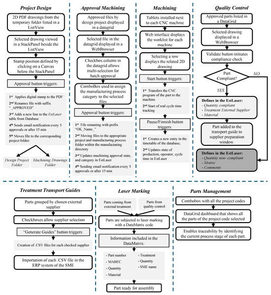 Beyond adopting ERP and MES principles, a critical stage in the development process was the in-depth analysis of the SME’s internal operations. This involved systematically mapping each stage of the production process and detailing daily tasks, thereby establishing a robust foundation for a solution that is closely aligned with the company’s workflows and practical requirements. Moreover, the application was designed not only to ensure reliable component traceability but also strengthen quality assurance through digital validations and stamping, support project management, centralized database logging, and laser-based DataMatrix part marking, all in line with the Industry 4.0 principles [18,19]. By addressing these critical gaps, GIP emerged as an essential tool for synchronizing project and production workflows, minimizing human errors, and boosting productivity in practical industrial contexts.