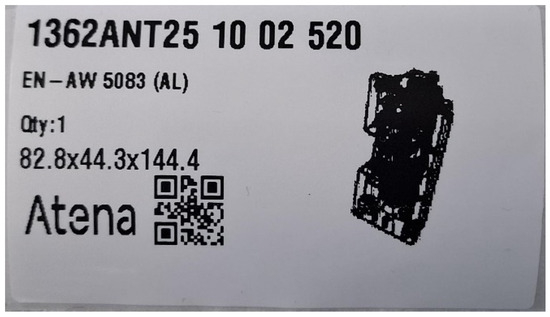 A recent development within the project was the introduction of labels that accompany each part throughout the production cycle, effectively replacing the previously used printed paper drawings. To support this transition, a stock management feature was added to the web version of GIP. This new module displays a list of parts that require verification of raw material availability before manufacturing can proceed. Once material availability is confirmed, labels are printed using a ZD421T Zebra printer (Zebra Technologies, Lincolnshire, IL, USA) and attached directly to the raw material of each part. Each label contains detailed information including the part’s code, quantity, type of material, if required heat or surface treatment, bounding box dimensions, the SME logo, a QR code and a snapshot image of the part. An example of these printed labels is shown in Figure 7. The label printing process was implemented using Python (version 3.13), due to its straightforward integration with the printer. The script is triggered directly from the Blazor Server application.