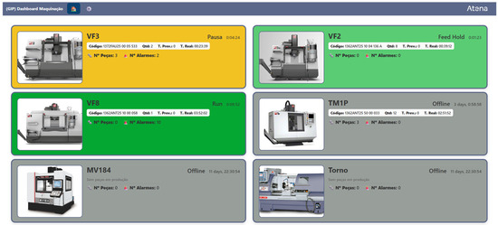 GIP also enabled the development of a monitoring dashboard for the SME’s CNC machines through the reading of each machine’s status lights. This allowed the construction of timelines indicating the duration each machine spent in various states, such as run, pause, and feed hold. Consequently, it is possible to determine the percentage and amount of time each machine was operational on a given day, providing insight into its performance. Figure 8 shows the dashboard under development.