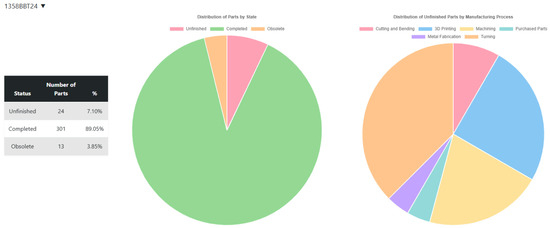 The centralization of information within a single database allowed for the development of a comprehensive dashboard that displayed key data for each part, organized by project. Users can easily select a specific project to view all associated components, facilitating real-time tracking throughout the production cycle. This improved visibility made it easier to identify the current stage of each part within the workflow, enhancing the ability to forecast production completion times and predict when specific parts will be ready. As a result, project managers can provide more accurate delivery schedules and better meet the customer deadlines. Figure 9 shows another dashboard that provides an overall view of the project. It displayed the percentage and number of parts that have been completed and those still pending. For the unfinished parts, it also indicated the manufacturing processes to which the remaining parts belong.