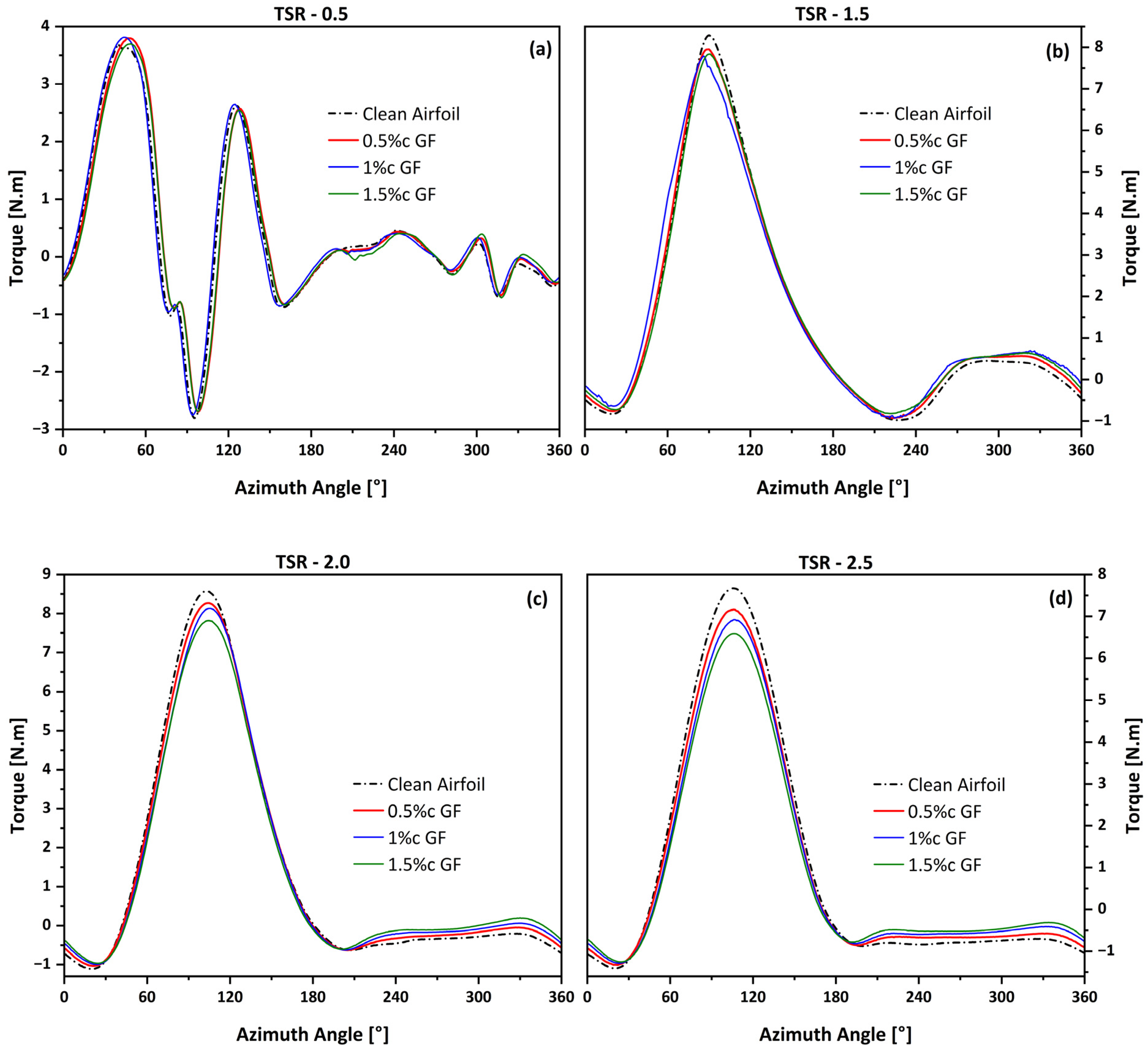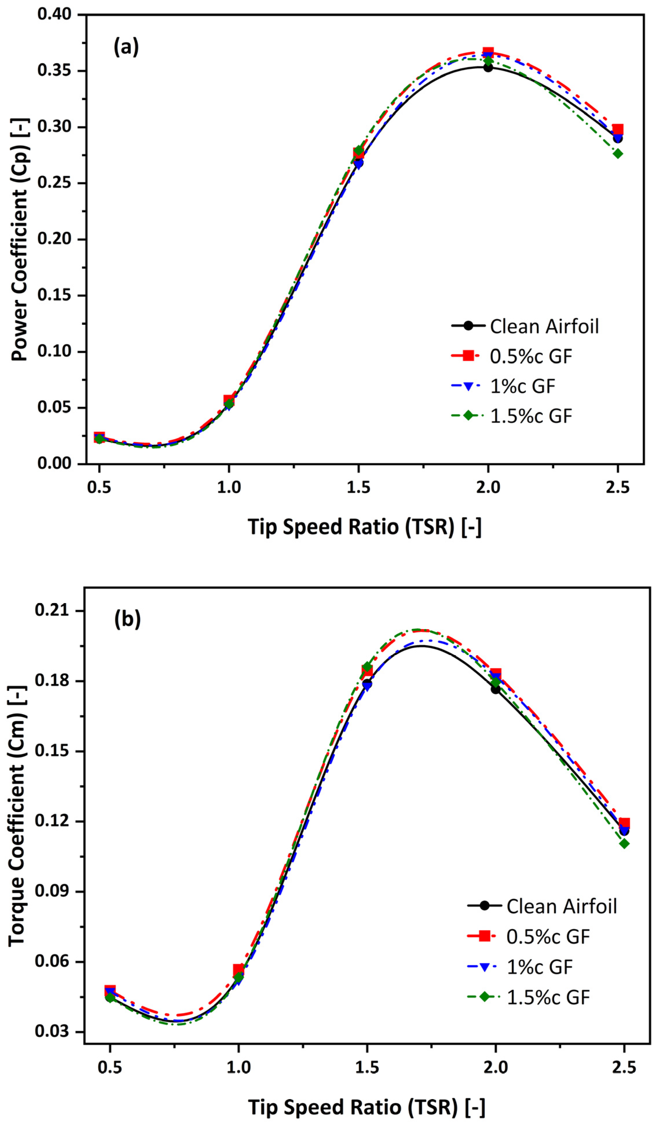 | TSRs | Configuration | Mean Torque Coefficient (Cm) | Mean Power Coefficient (Cp) | Change in GFs vs. Clean Airfoil (%) |