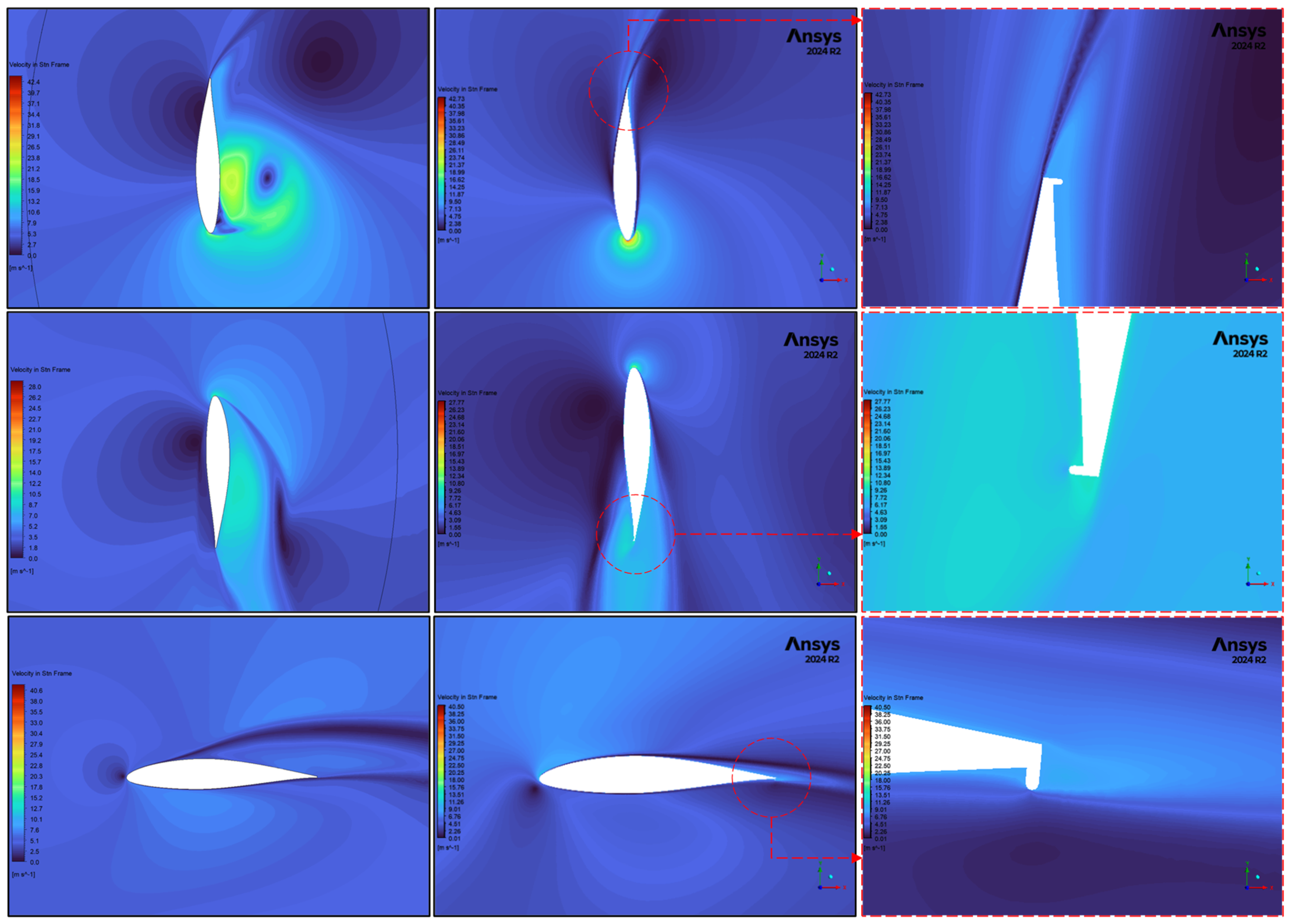 - Downwind Phase (θ = 270°): The true advantage of the 0.5%c GF is revealed during the downwind pass. At θ = 270° (Figure 12), the blade moves through turbulent air while experiencing a negative angle of attack, a condition ripe for high drag and negative torque. The clean airfoil exhibits a massive, disorganized, low-velocity wake, which is indicative of significant pressure drag. The 0.5%c GF fundamentally alters this wake structure. It traps a small, stable vortex between the flap and the trailing edge, which helps to stabilize the downstream flow, narrow the wake, and significantly reduce the size of the separated region. This mitigation of pressure drag reduces the negative torque, leading to a higher mean torque over the entire cycle and explaining the 3.21% power improvement at this TSR.