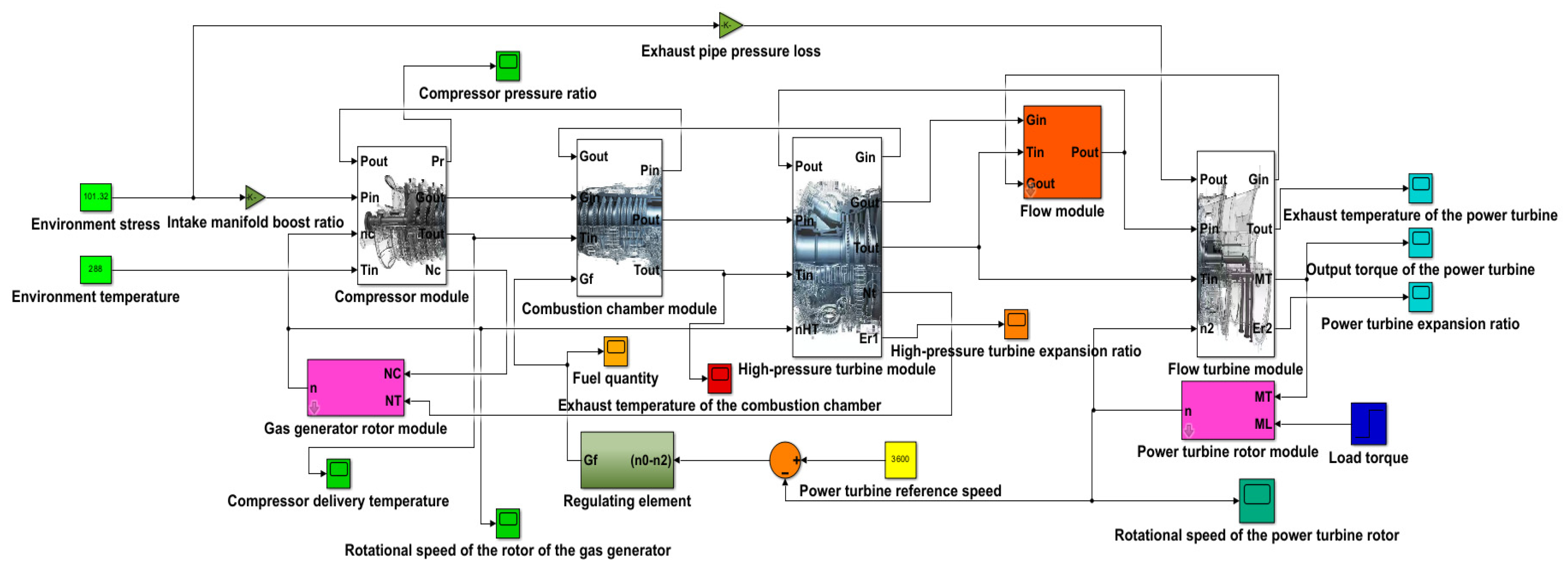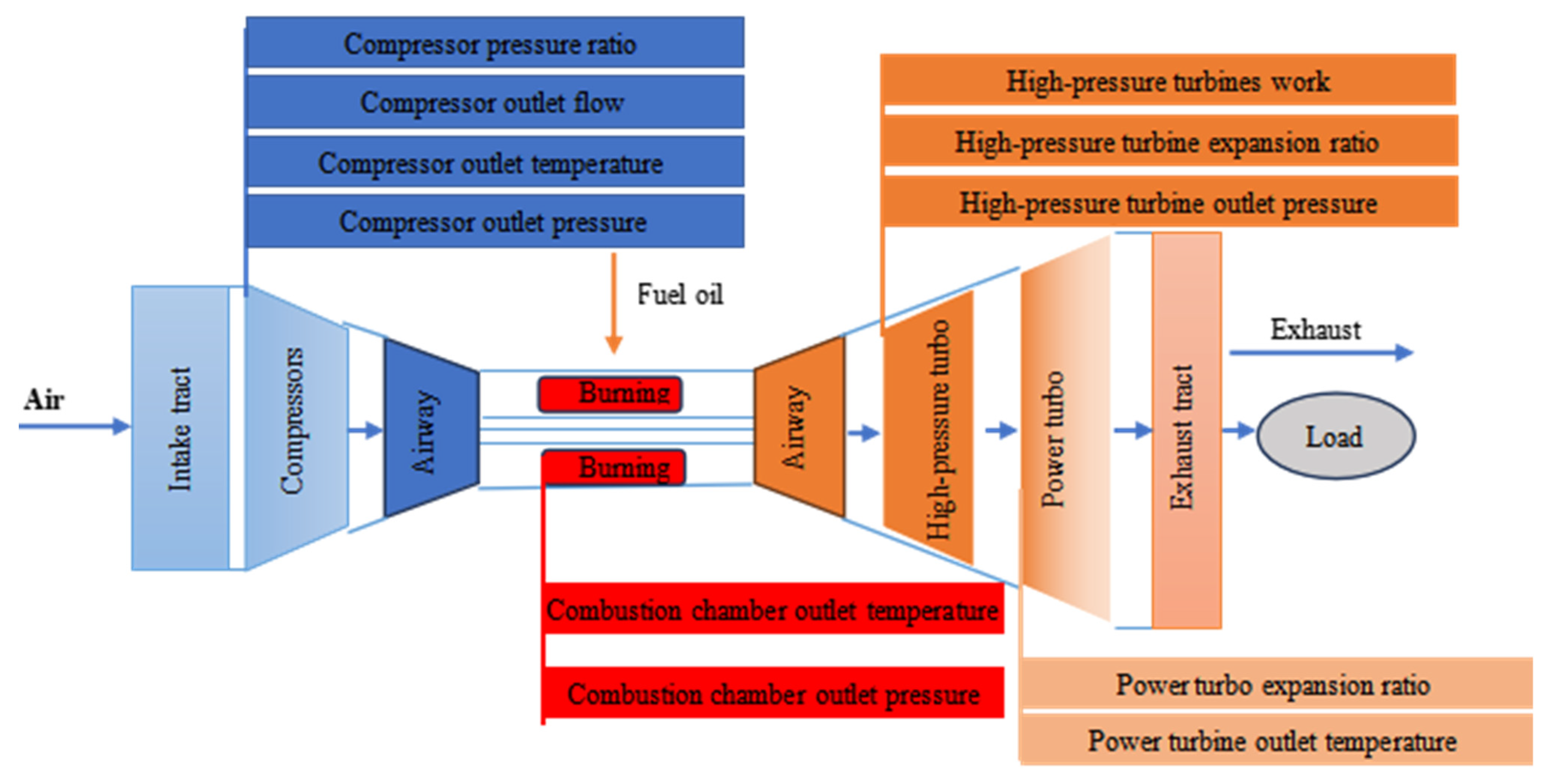 34]. To meet fault identification requirements, key monitoring parameters were selected, including the temperature, pressure, and rotational speed of relevant components—specifically covering the compressor outlet (flow rate, temperature, pressure), combustion chamber outlet (temperature, pressure), high-pressure turbine outlet (temperature, expansion ratio), and power turbine outlet (temperature, expansion ratio) at critical component interfaces. As illustrated in
