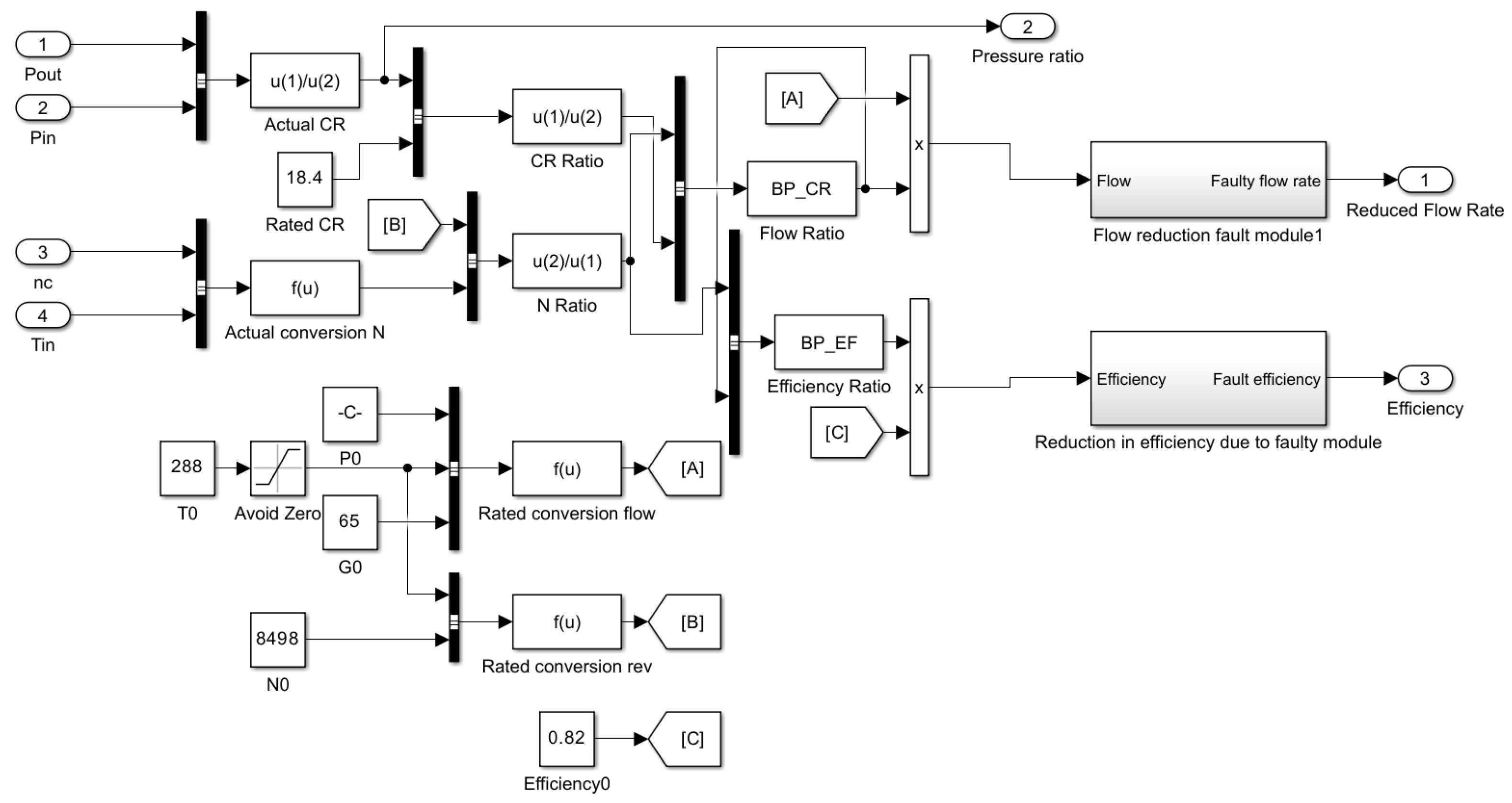 Figure 3. To simulate the state and performance changes of the compressor when blade fouling occurs at a specific time, a fault module is introduced into the model, with a typical fouling evolution curve at its core. The fault module works by constructing a characteristic function that adheres to the predefined fault criteria for each component and allows setting the exact time of fault initiation based on research requirements. Once the fault is triggered, the function applies a time-varying perturbation to key parameters using a sine-based profile. Specifically, compressor fouling is simulated by perturbing the flow rate as 7% × sin(πt/T) and the efficiency as 2% × sin(πt/T), where T = 1000 s. This approach models the gradual accumulation of fouling, with the perturbation intensity starting at zero and increasing smoothly to its maximum over the course of 1000 s, effectively capturing the progressive nature of the fault.