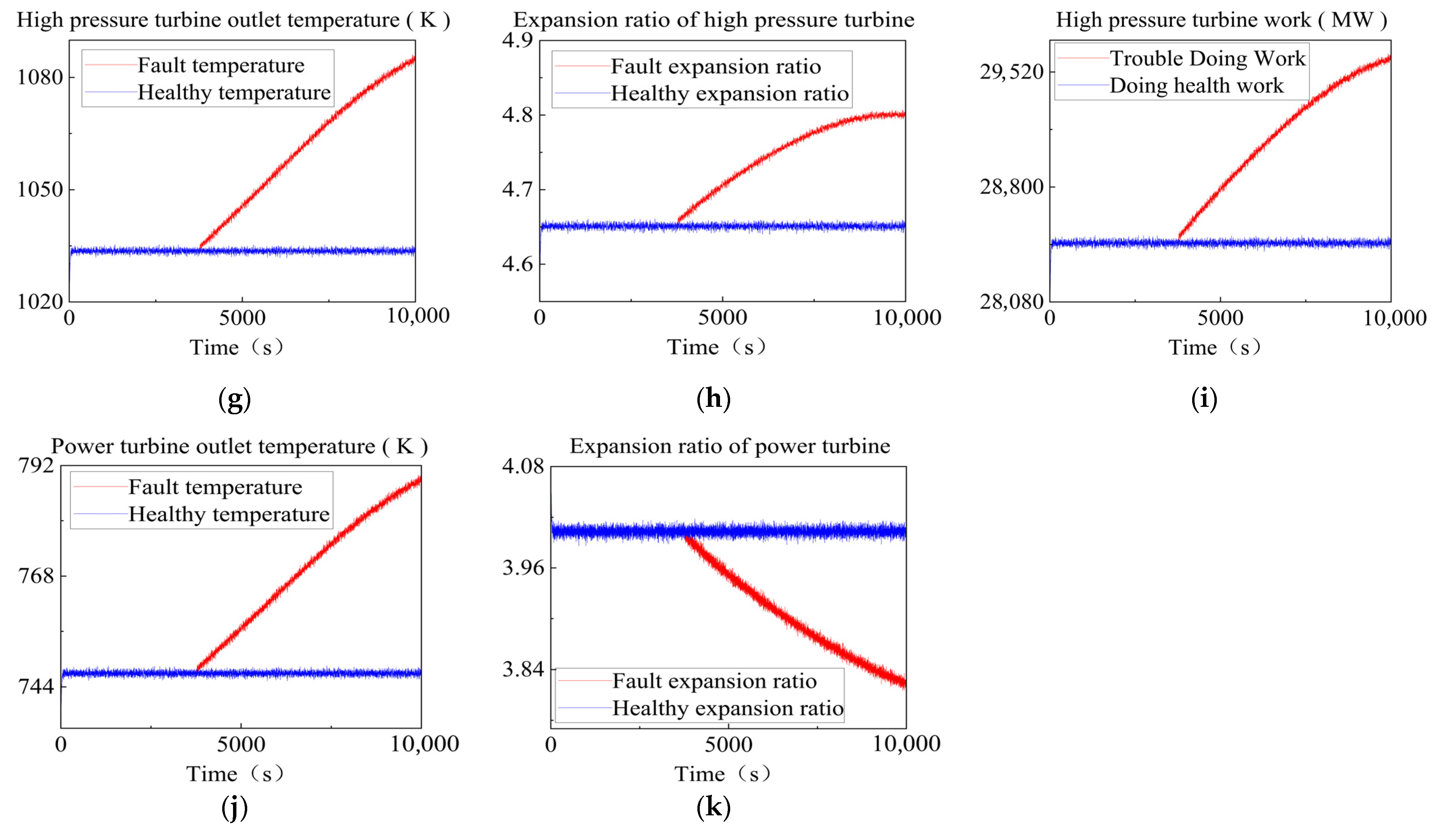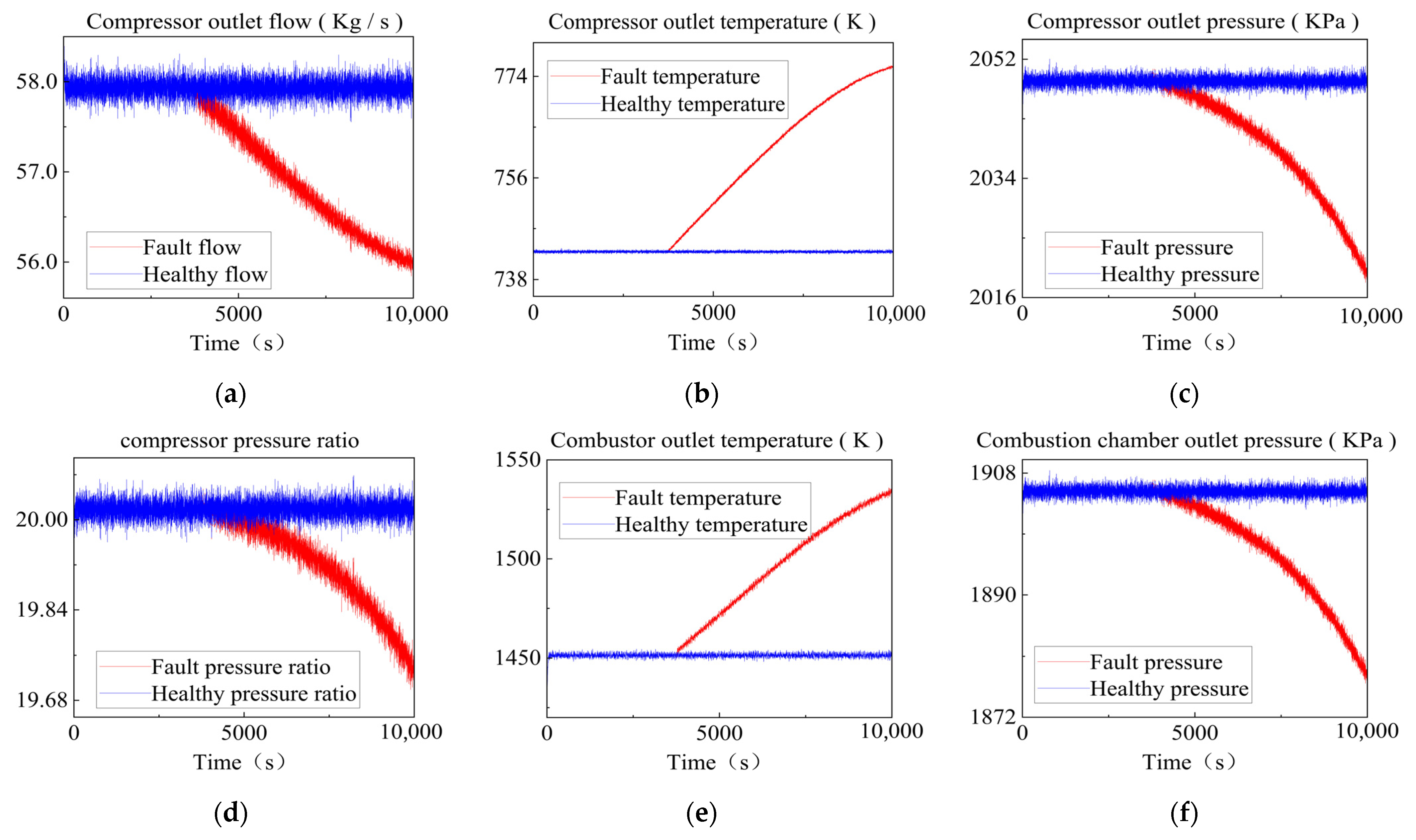 Figure 5. Parameters such as compressor flow rate, combustion chamber outlet temperature, power turbine expansion ratio, and high-pressure turbine outlet temperature exhibited a clear degradation trend, directly indicating that compressor fouling impairs overall system performance. Notably, the fault’s rapid manifestation (observable within minutes) is an accelerated simulation designed to meet engineering research needs—while actual compressor fouling develops gradually over months or even years, this accelerated approach (common in turbine fault studies [