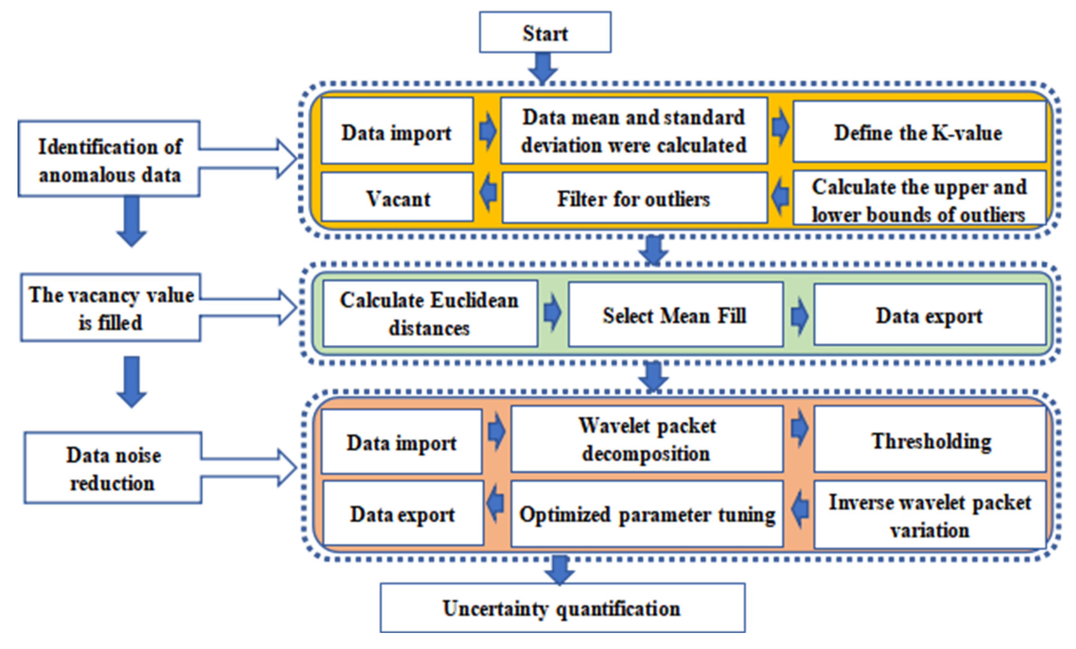 (3) This study, following the implementation of outlier removal, missing value imputation, and wavelet packet Bayesian denoising, has achieved a 98.8% reduction in the uncertainty of each parameter compared to the original data, demonstrating improvement.
