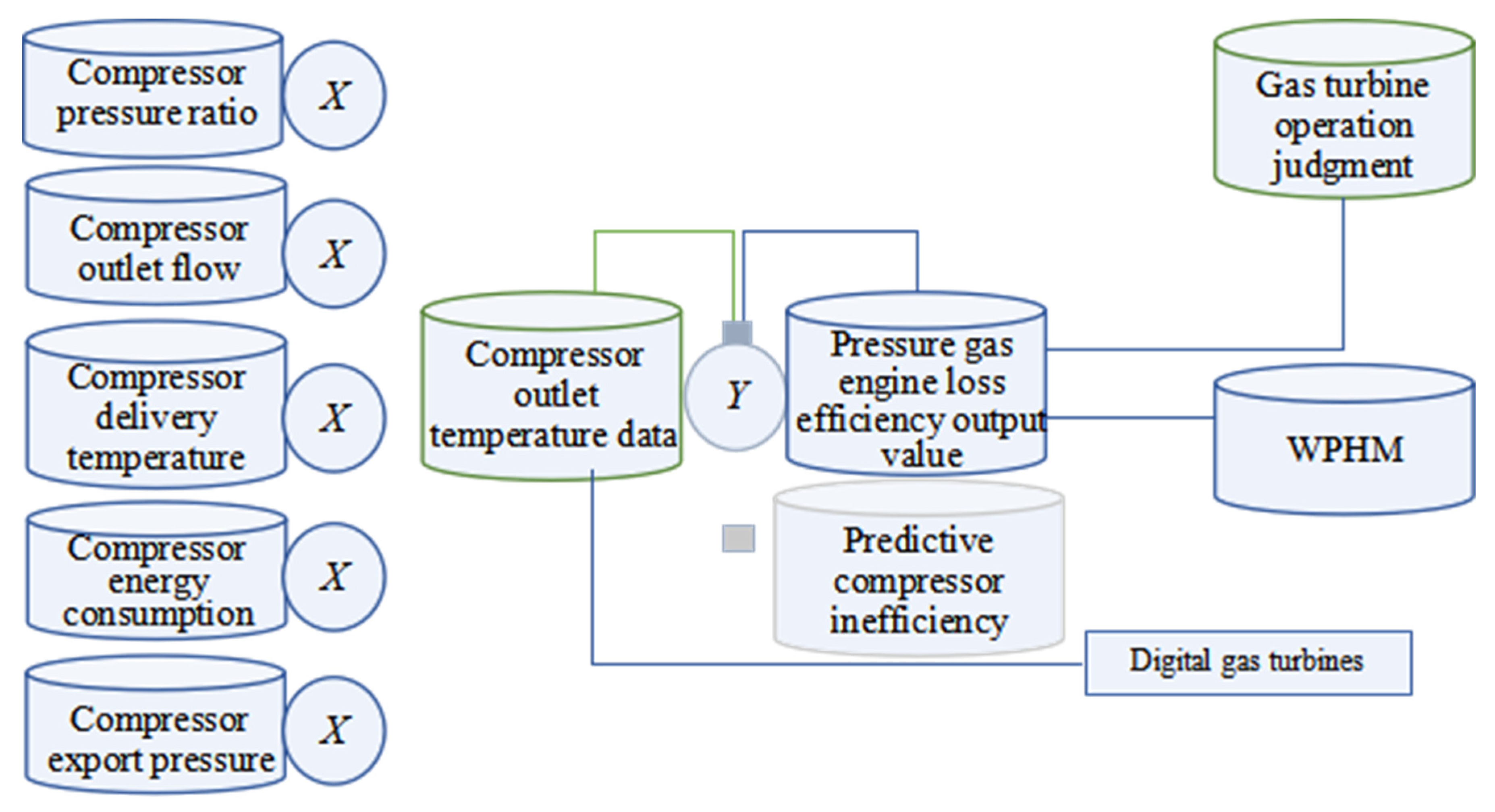 Finally, digital gas turbine data is selected for model adjustment, and the output failure probability is used for compressor fouling fault assessment. When the calculated failure rate exceeds the specified threshold, an alarm signal is issued. A compressor fouling fault early warning model as shown in