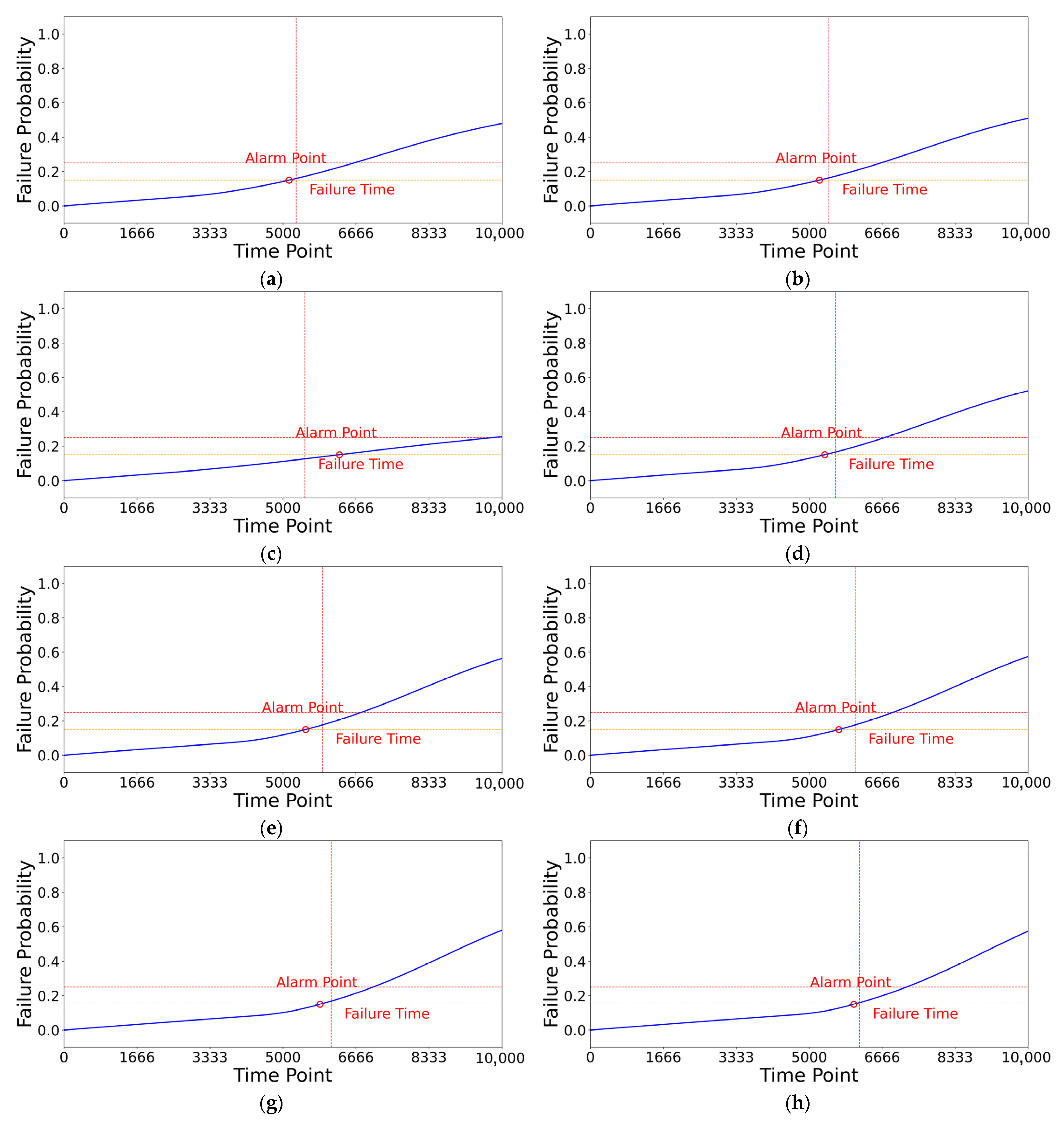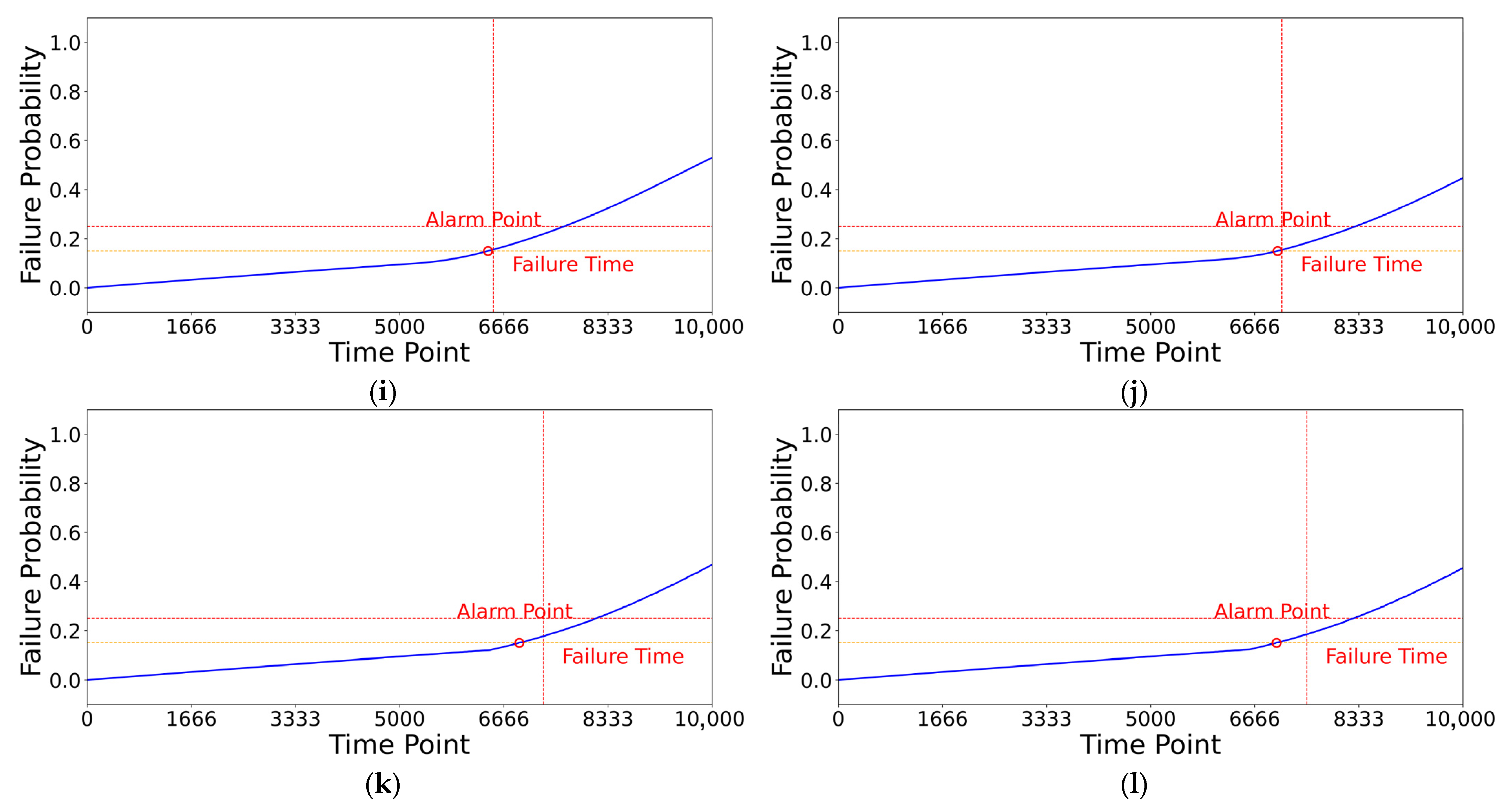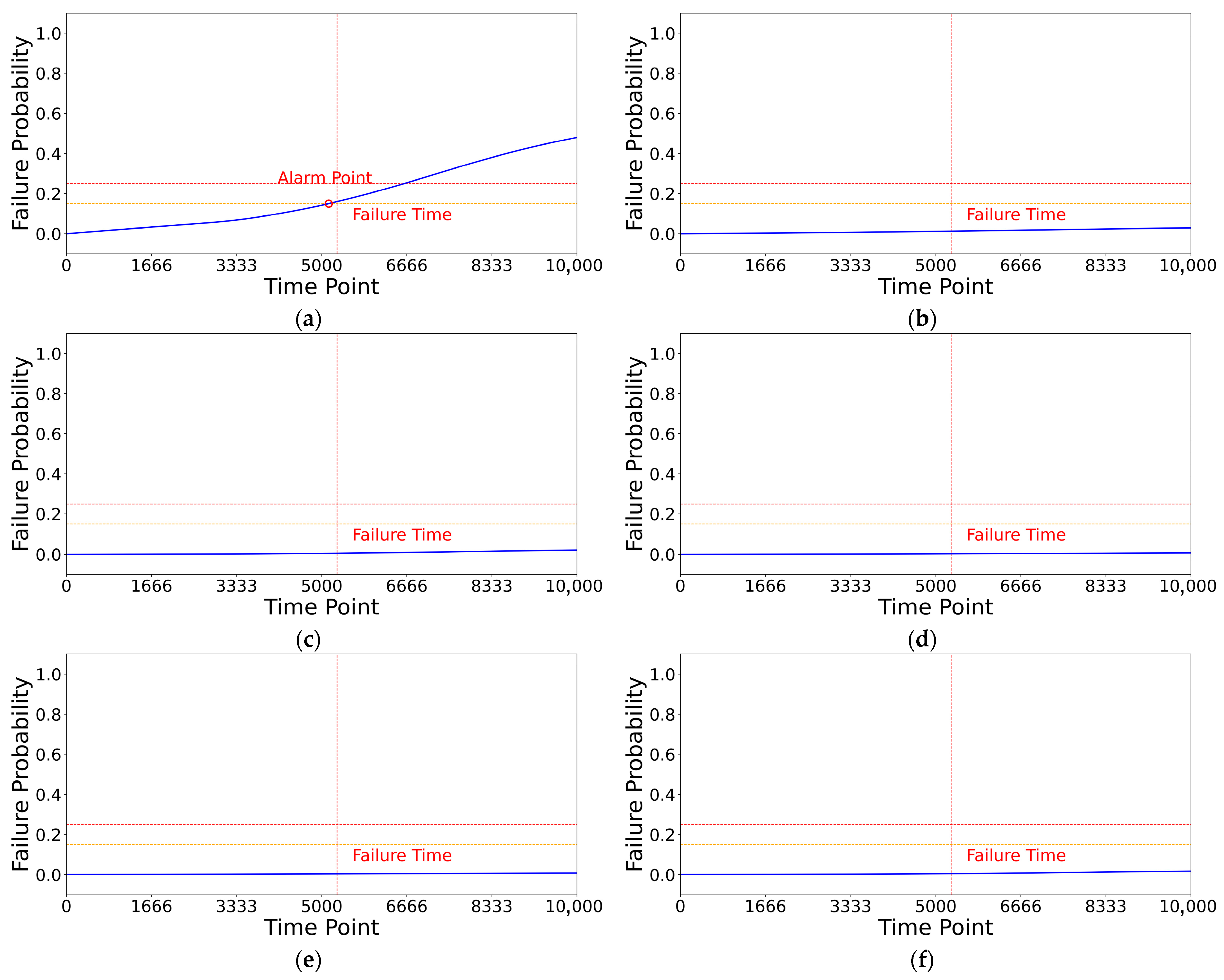 Figure 10, the compressor fouling fault data is substituted into the WPHMs of each component for verification. The blue solid line in the figure represents the failure rate of the model, where a higher failure rate indicates a greater likelihood of component failure. Through experimental analysis of the training units and calculation verification of the test units, a failure probability of 0.15 is selected as the early warning threshold (shown as the yellow dashed line in the figure). This threshold enables early fault warning before failure, realizing condition monitoring of components. Meanwhile, a failure probability of 0.25 is selected as the failure threshold (shown as the red dashed line). When the failure probability exceeds this threshold, the unit is considered to be on the verge of failure. The red vertical line represents the actual failure time set in the simulation. It can be observed that only when the compressor fouling fault unit data is input into the compressor fouling fault WPHM does the fault curve rise, and the failure rate of the unit has increased before failure. This indicates that the model can monitor the occurrence of faults and accurately identify fault types, and the failure rate curve can describe the reliability of components.