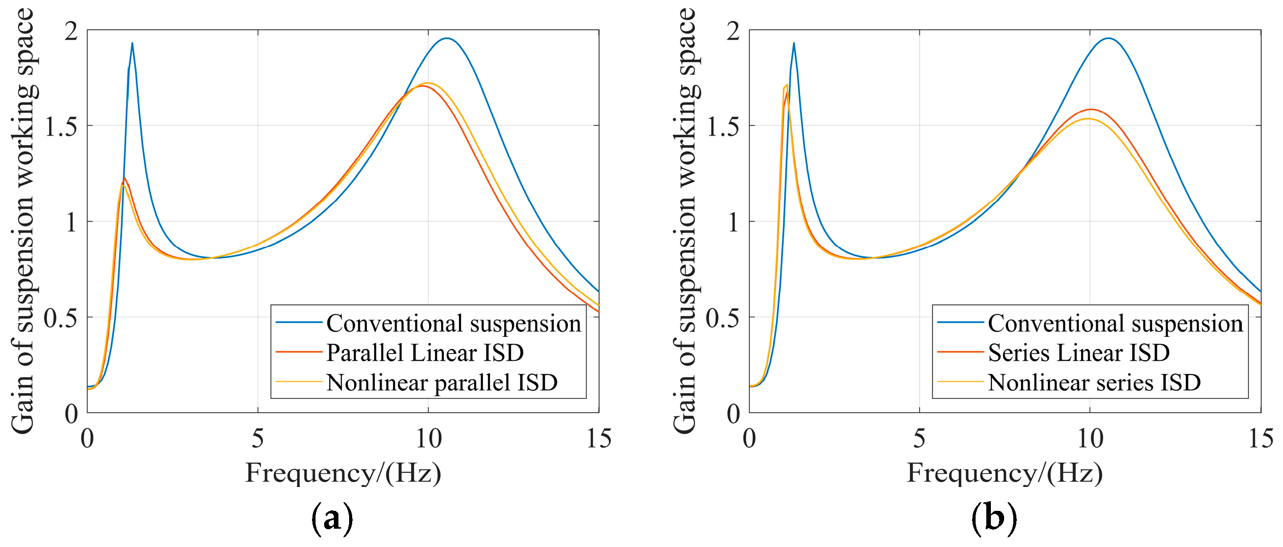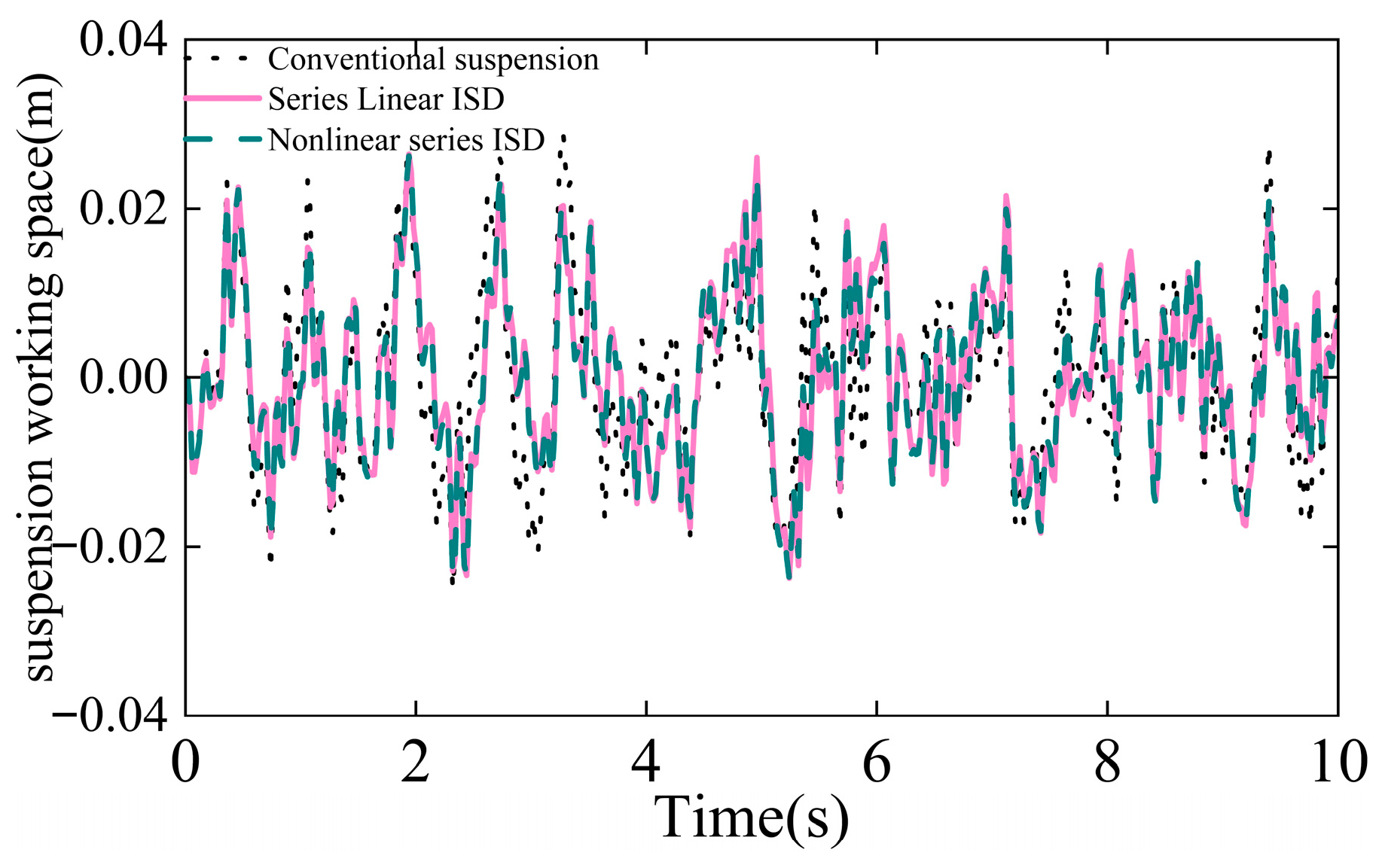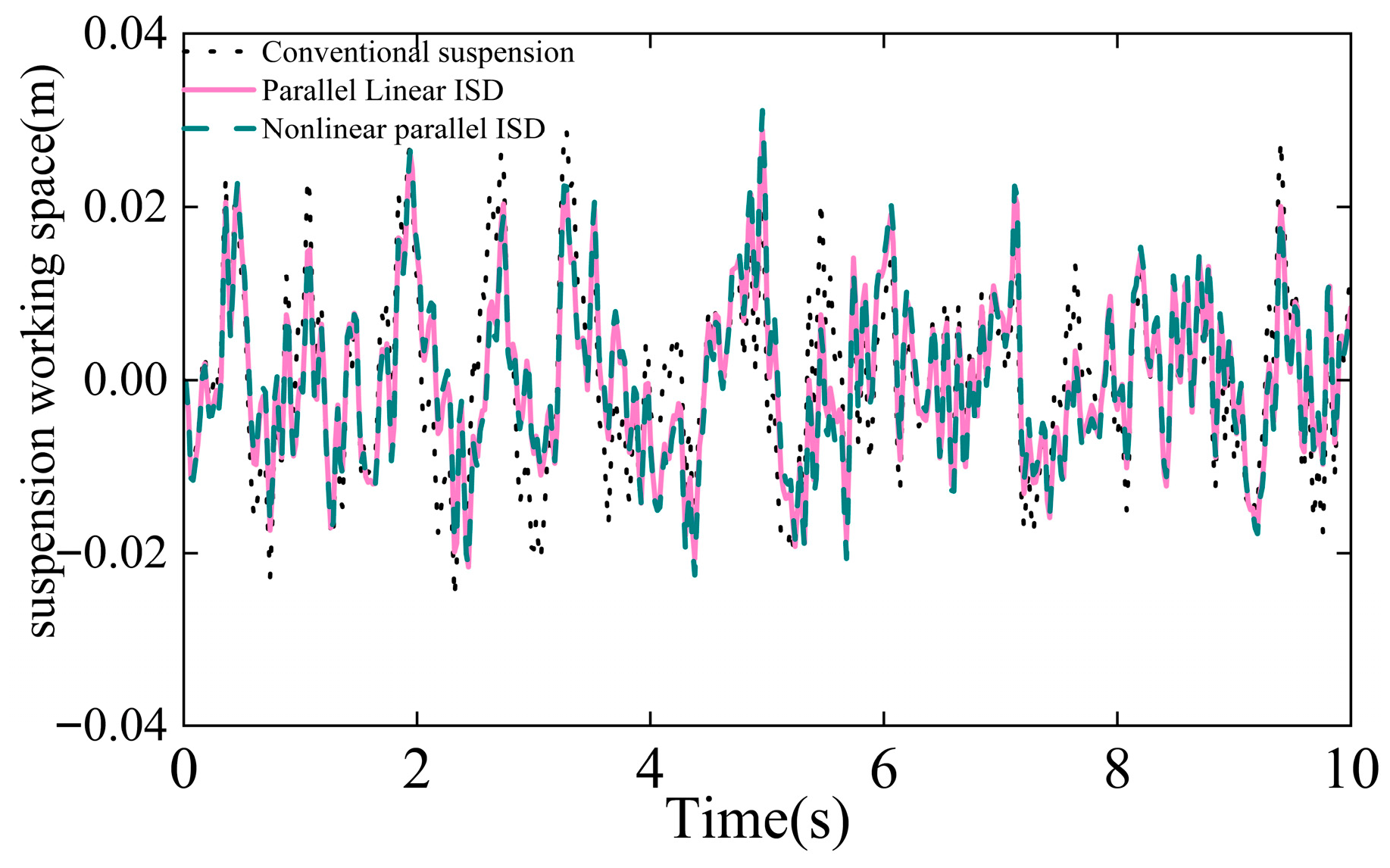 Figure 7 demonstrate improved control over suspension working space, with the nonlinear parallel ISD exhibiting the smallest deflection. Furthermore,