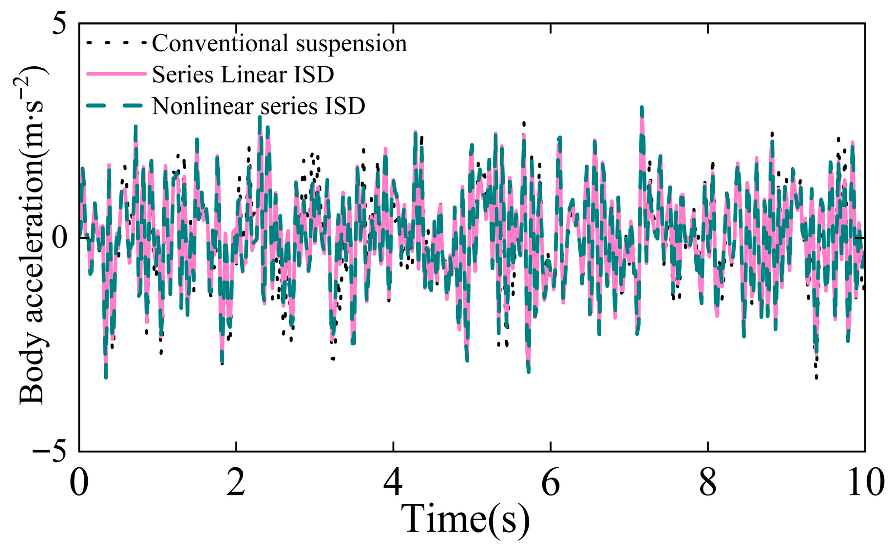 Figure 6 show that both linear and nonlinear ISD suspensions effectively attenuate body acceleration compared to the passive baseline.