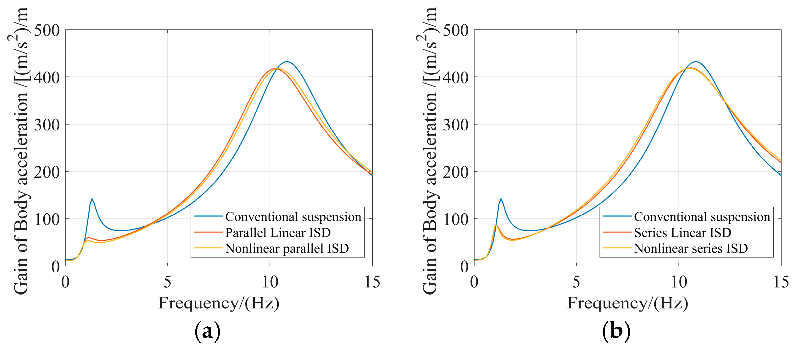 For the parallel configuration, the nonlinear ISD achieved a 7.98% BA reduction over the conventional suspension and a 2.04% BA reduction over the linear ISD, along with a 1.69% DTL reduction and a 0.79% DTL reduction over the linear ISD. For the series configuration, the nonlinear ISD achieved a 7.62% SWS reduction over the conventional suspension and a 0.95% SWS reduction over the linear ISD, along with a 6.42% DTL reduction and a 1.24% DTL reduction over the linear ISD.