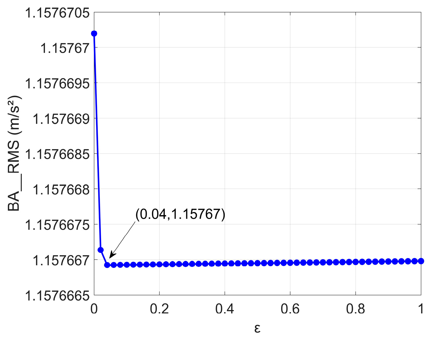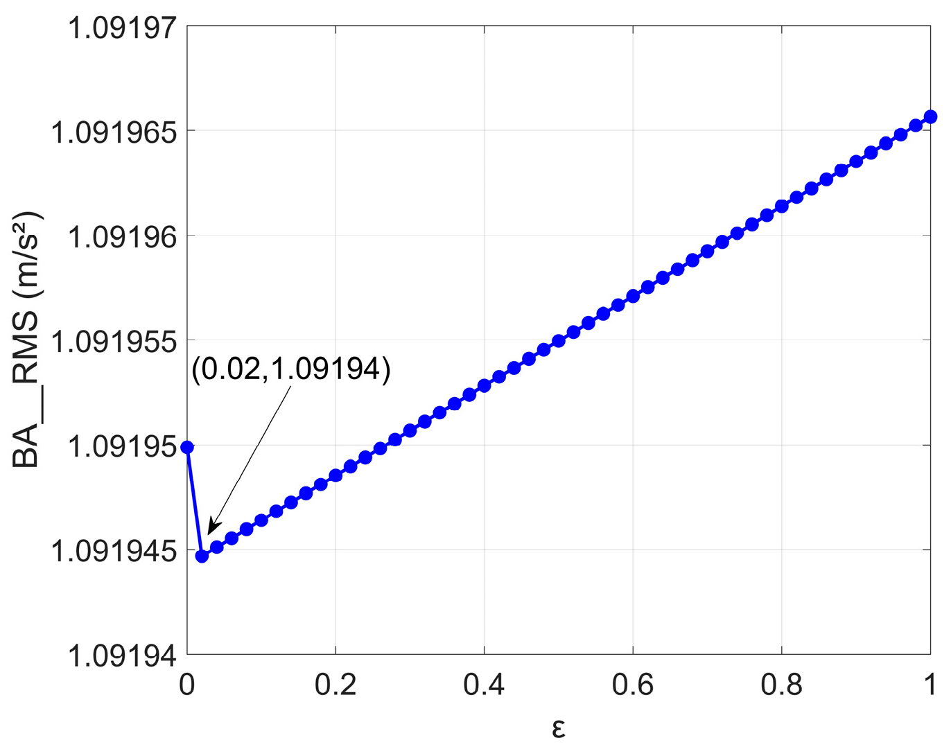 Compared to the conventional passive suspension, all dynamic performance indices exhibit significant reductions. For the parallel suspension with linear springs, RMS values of BA, SWS, and DTL decrease by 5.94%, 10.48%, and 0.9%, respectively. With nonlinear springs, these indices decrease by 7.98%, 8.57%, and 1.69%, respectively. For the series suspension with linear springs, RMS values of BA, SWS, and DTL decrease by 4.28%, 6.67%, and 5.18%, respectively. With nonlinear springs, these indices decrease by 2.53%, 7.62%, and 6.42%, respectively. For the series suspension, the optimal ε = 0.07, although the BA shows a slight increase (1.1568 m·s−2) compared to the linear ISD suspension (1.1360 m·s−2); this represents a deliberate trade-off to achieve more substantial reductions in SWS and DTL.