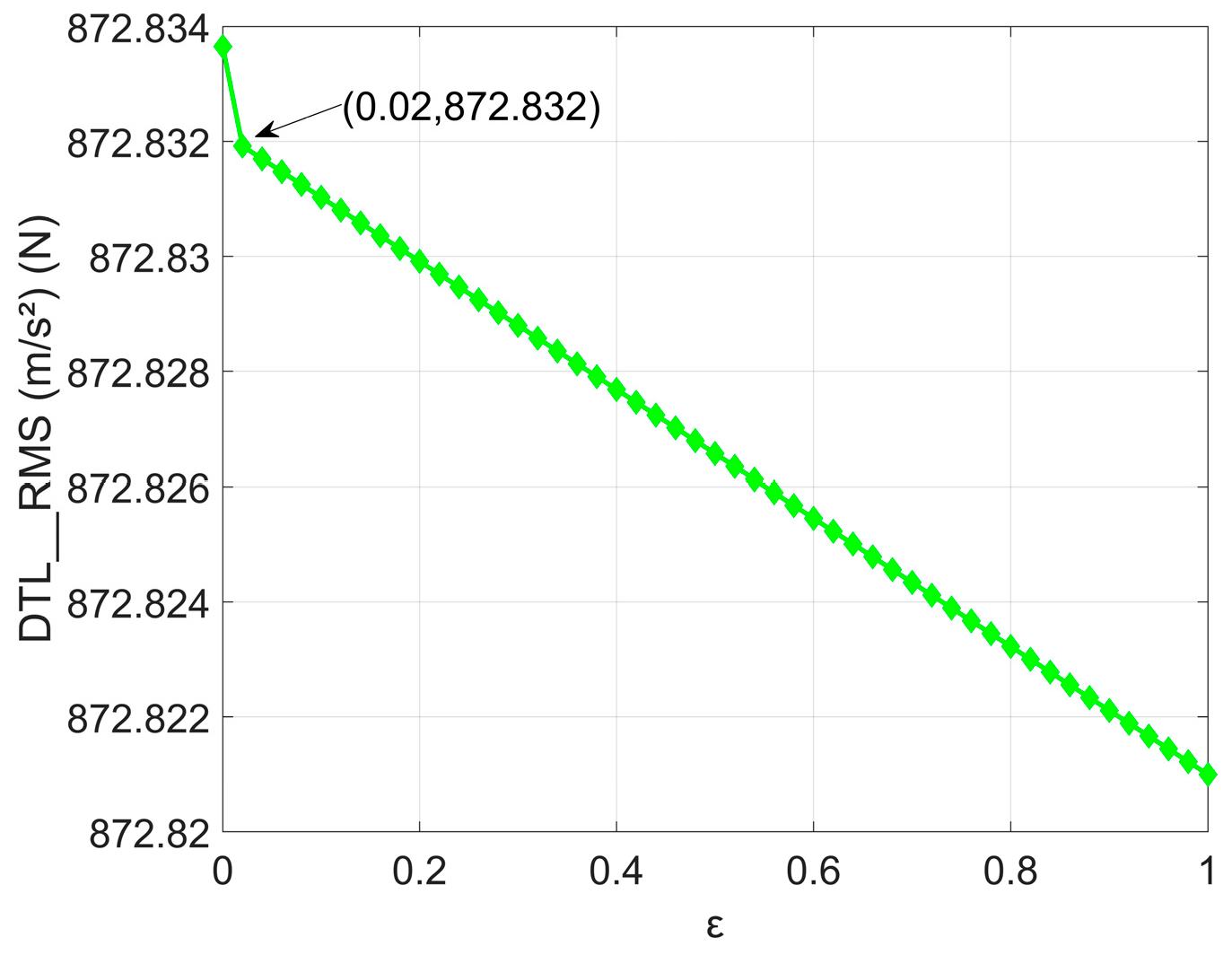 ε. This trend signifies that increasing the nonlinearity degree progressively improves the suspension’s ability to limit dynamic deflection and enhances tire ground contact stability. The opposing trends establish a fundamental performance trade-off in the parallel configuration.