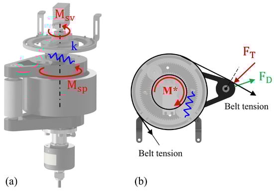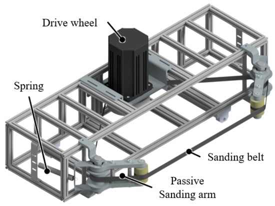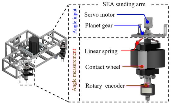 Figure 3 shows the sanding module, which is capable of sanding the target with a sanding belt. The sanding belt is rotated by a driving BLDC motor (TM13-D2021-S-4P-K-SG DC24V 2KW, motorbank, Seoul, Republic of Korea), controlled by an MD2K motor driver, and supported by the two contact wheels, two idlers on the sanding arms, and two additional idlers on the re-tensioner. A DC power supply (TS6015A 60 V/15 A 900 W, Toyotech, Seoul, Republic of Korea) is used to ensure stable power delivery to the driving wheel. For the sanding arm, a reaction force-sensing SEA mechanism (RFSEA), in which the spring is located before transmission, is applied to measure and control the torque applied to the arms []. The sanding arms measure the torque exerted on both arms, calculate the reaction force from the target surface using linear springs and rotary encoders, and track the desired force. The upper parts, indicated in blue in Figure 3, are responsible for the angle input, while the lower parts (indicated in red) measure the actual rotated angle. The servo motors on each arm (B250 Brushless Servo, Highest, Seoul, Republic of Korea) were chosen such that they could generate more than 2 Nm at a voltage of 6 V for an estimated reaction force of 10 N. Four linear springs with lengths of 40 mm and spring constant k of 3.34 N/mm with an initial tension  of 12.75 N were used and aligned in the rotational direction. A rotary encoder (E50S8-8000-3-V-24, Autonics, Busan, Republic of Korea) with a resolution of 8000 was used to measure the arm rotation angle and calculate the reaction force at each arm.