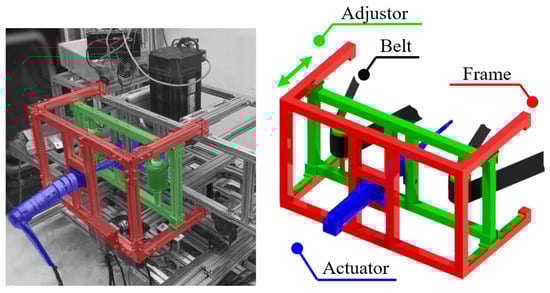 As shown in Figure 4, the re-tensioner pulls the belt from the target object or vice versa to maintain the proper tension. An adjuster moving back and forth with a ball screw with a pitch lead of 4 mm, a diameter of 12 mm, and a DC motor (PGM42-4566, 1/4, 12 V, motorbank, Seoul, Republic of Korea) was used. Two idlers are attached to the actuator to guide the belt and prevent it from detaching.