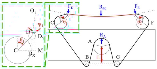 Figure 7 shows the overall belt configuration during the sanding process, where point O is the center of the target surface.  and  are the forces exerted on D and E, respectively, on the contact points with the target surface;  is the force exerted on the drive wheel from the belt tension; and , , and  are the reaction forces on the target surface, where M is the midpoint between D and E on the target surface. For the analysis associated with Equations (3)–(7) and the free-body diagrams, we adopt three working assumptions that align with the reported operating regime. The belt is treated as inextensible on each straight or wrapped segment during a pass, so tension within a given segment is uniform and variations arise from geometry rather than stretch. The support wheels at C and D are bearing-mounted and do not transmit appreciable resisting moments; therefore, support moments are neglected in the two-point contact case. The contact geometry is evaluated within the convex curvature range represented by the tested plates in this study; behavior outside this range may require additional compliance or contact modeling. These assumptions justify the quasi-static simplifications used in the force balance and are referenced alongside Figure 7.