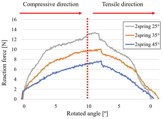 Reaction force with respect to the rotated angle for the two-spring cases.