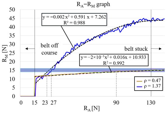 The relationship between , which is the force exerted on the drive wheel by the belt tension, and , which is the force at the midpoint of the target surface from the belt tension, was empirically determined, as shown in Figure 10. There was insufficient tension on the belt to rotate when  was below 15 N, and the belt rotation was stopped because the tension was too high when  exceeded 130 N.