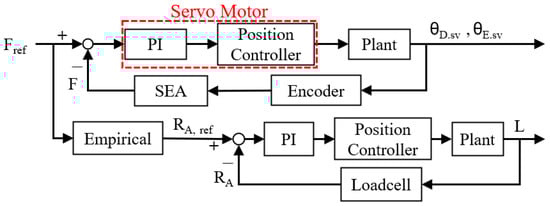 The control of the force acting on the contact point on the SEA arm with the target surface and the PI control applied to the BLDC motor that controls L (the distance between the re-tensioner adjuster and the center of the drive motor) follows the form shown in Figure 11. The belt tension reference  was obtained from the empirical  map in Figure 10 and applied within its observed range. Using this reference, PI control was executed while the achieved forces were assessed by the load cells at D, M, and E; the measurements track the targets under the stated operating conditions.