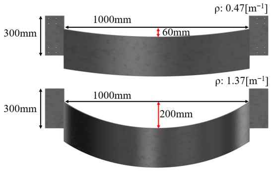 During the abrasion process, including sanding, the surface roughness of the target surface converges to a certain value under a controlled feed rate and force []. This, along with the evenly distributed normal force, allowed the vertical movement of the robot to evenly cover the entire convex surface. Figure 12 shows the target surface dimensions, which were selected to meet the standard outlined in the European Union’s ADR Agreement for the International Carriage of Dangerous Goods by Road, with a long axis diameter of at least 1.5 times the short axis diameter [].