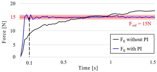 In the first case, without belt rotation, the force tracking ability between the SEA arm with and without PI control was measured.  was set to 0.3 for both the SEA arm and the re-tensioner, while  was set to 0.1 and 0.05 for the SEA arm and re-tensioner, respectively. Figure 13 shows the forces measured at contact point E with and without PI control. As shown in the figure, a settling time of 0.096 s is observed for the PI-applied SEA arm, following a 4% error range around the reference force of 15 N. However, owing to the overlapped belt joint, vigorous vibration was inevitable even with a drive wheel of 300 rpm. Accordingly, a simple moving average (SMA) filter was used for evaluation, as in Duong et al.’s work [] for a vibration sensor application using (10).