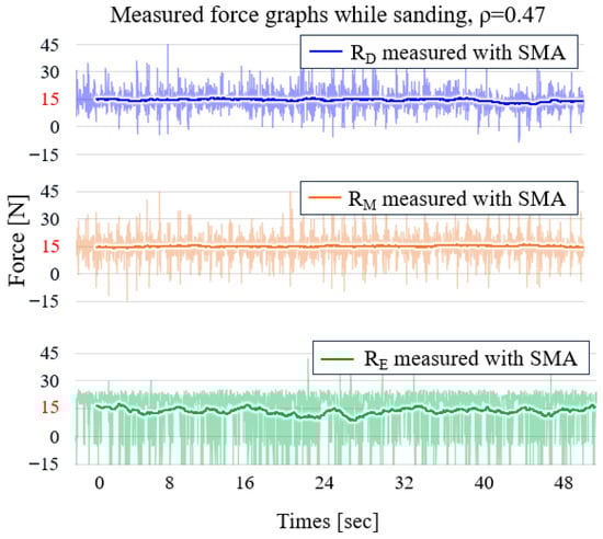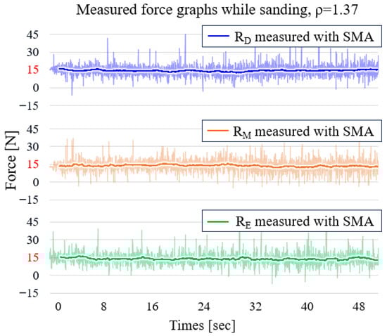 Figure 15 shows the reaction force measured on points D, M, and E on the target surface with a curvature of 0.47. Figure 16 shows the same but for a target surface with a curvature of 1.37 during the sanding operation, with the same SMA window size percentage as before. These figures show that the force-tracking ability of  is superior to that of . This is because of the belt rotation direction. For the SEA arm at point D, the belt moves in the direction that extends the spring while compressing the spring on the SEA arm at point E. However, because extension springs are used in this mechanism, the belt cannot be further compressed, making the force-tracking ability of the SEA arm at point E slightly inferior to that at point D.