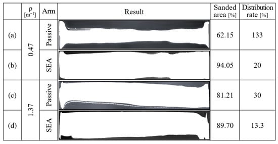Figure 19 shows the vertical sanding process results with SEA and passive arms on each target surface. For the target surface with a curvature of 0.47, a 31.85% improvement in the sanded surface area was achieved, from 62.2% to 94.05%. For a target surface with a curvature of 1.37, an 8.49% improvement was achieved, from 81.21% to 89.7%.