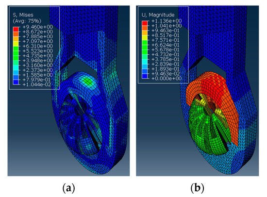 The ball inside the housing has a cylindrical section inserted and is applied with a clamping force. (a) The von Mises stress observed in MPa. (b) The deformation observed in mm.