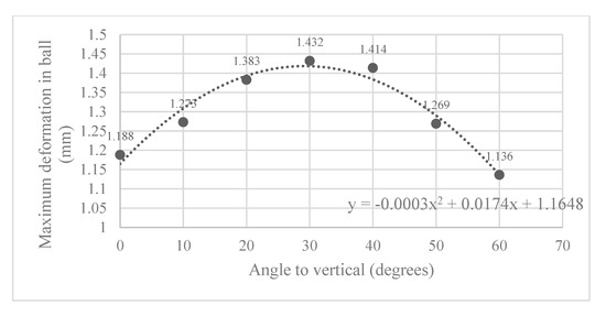 Abaqus is set to detect general contact between parts, with contact properties between certain surfaces specified by their matching coefficient of friction listed in Table 2. For every simulation, the “Dynamic, Explicit” package is used, the precision is set to “Double—analysis + packager”, and the Nodal output precision is set to “full”. Starting with the ball making a 0° angle with the vertical, the simulation is repeated for every 10° turned in the xz-plane, with the axis of rotation as the negative x-axis following right-hand convention (refer to Figure 4).
