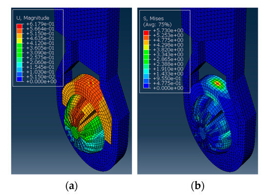 Here, the Abaqus FEA simulation results for each ball orientation are presented. One instance of the von Mises stress and deformation in the ball joint assembly is shown in Figure 5a and Figure 5b, respectively. Moreover, the maximum deformation recorded at each ball angle under clamping is reported in Figure 6.