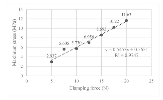Also of interest, is seeing how the von Mises stress and mean contact force change with increasing clamping force. Figure 9 shows that the maximum von Mises stress observed is positively correlated to the clamping force, and none of them exceed the 19 MPa yield stress limit. In Figure 10, the magnitude of the mean contact force positively correlates with the clamping force, and so does the standard deviation of contact forces under each clamping force.