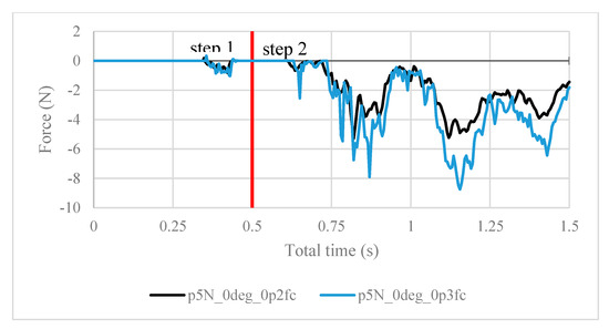 It is worth noting the following trends in the contact forces graphs shown above. In step 1, fluctuations in the contact force are due to the inner surfaces of the ball touching the arthroscope and pushing it against the other side of the ball. These values are insignificant in finding the force resisting the scope from sliding. In step 2, the results are as expected. In Figure 8, the maximum contact force magnitude increases as the clamping force increases. As the arthroscope section keeps being displaced, the contact force gradually decreases. The same trend is shown in Figure 11, though the results are greater in magnitude due to the greater friction coefficient, which is expected. One case of this is also confirmed in Figure 12, where the contact forces under 5 N clamping for both the 0.2 and 0.3 friction coefficient are compared.