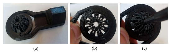 (a) The 3D-printed rod end using PLA; (b) deformation of the slit ball with the clamping force applied without the scope; and (c) deformation of the slit ball with the clamping force applied with the scope.