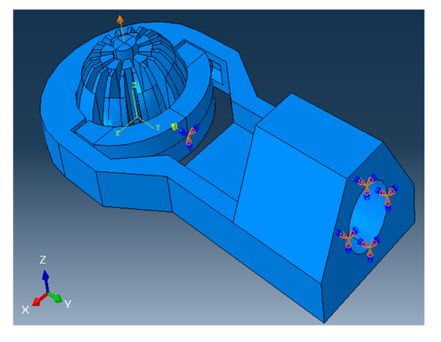 | Encastre—full constraint on all degrees of freedom | Hole at end where a brass insert is meant to be attached | Ball joint assembly is screwed onto the flexible arm |
