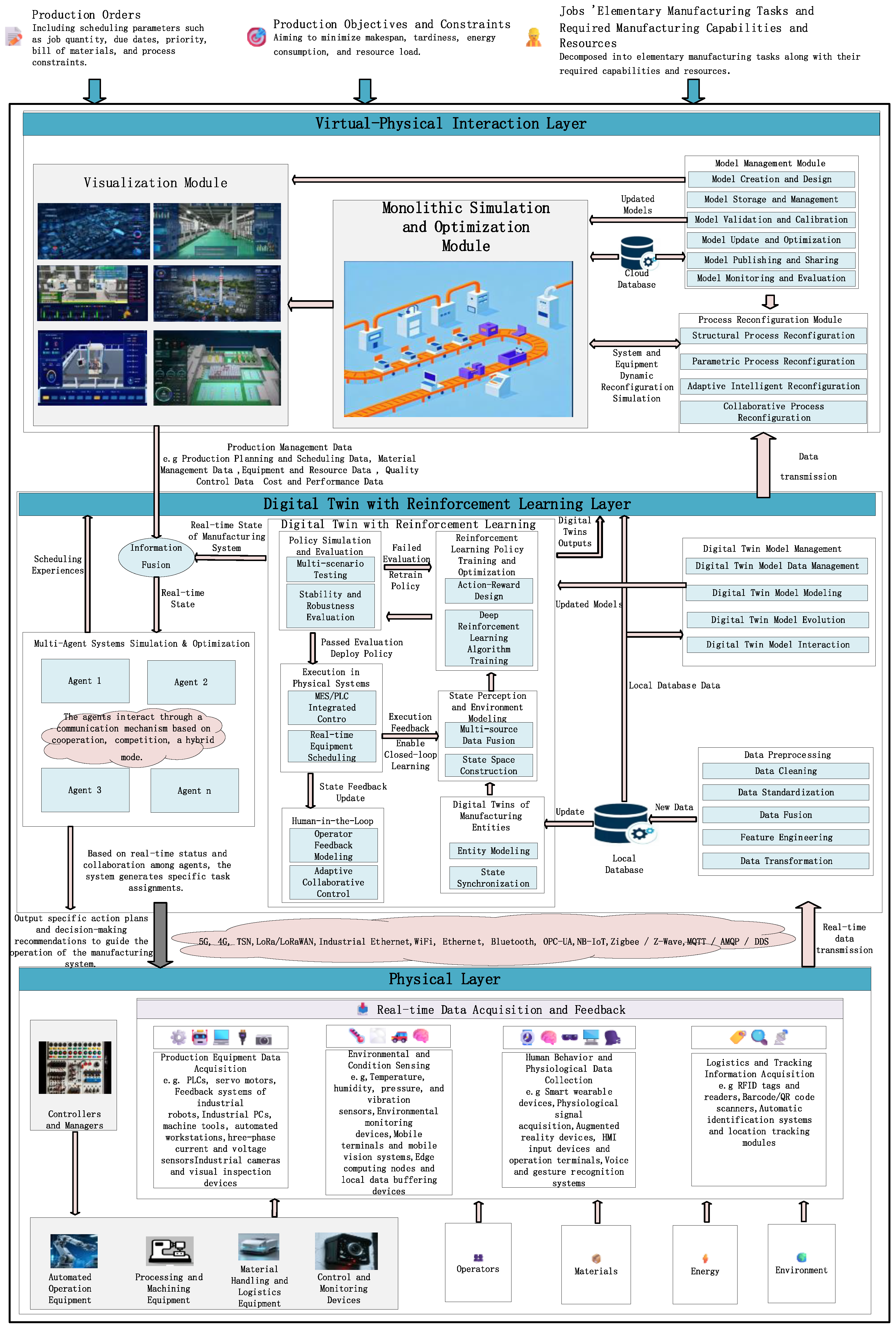 | 45 | 2022 | Serrano-Ruiz, Julio C., et al. [173] | Development of a Multidimensional Conceptual Model for Job Shop Intelligent Manufacturing Scheduling from the Industry 4.0 Perspective. | Job shop | DT. DRL. Zero-defect manufacturing | Job shop scheduling lacks a unified, structured conceptual model under Smart Manufacturing Scheduling (SMS) to boost efficiency and autonomy. | A systematic literature review leads to a three-axis framework: (1) semantic ontology context for unified knowledge/data semantics; (2) hierarchical agent structure for organized, collaborative decision-making; and (3) deep reinforcement learning (DRL) for adaptive, learning-based scheduling. Criteria are defined to assess benefits/limits and aggregate synergistic attributes. | The model enables greater flexibility and rescheduling capability toward autonomous operation, fills a gap by synergizing key Industry 4.0 principles for SMS, and provides guidance for practitioners and researchers advancing job-shop digital transformation. | JOURNAL OF MANUFACTURING SYSTEMS | ELSEVIER SCI LTD |