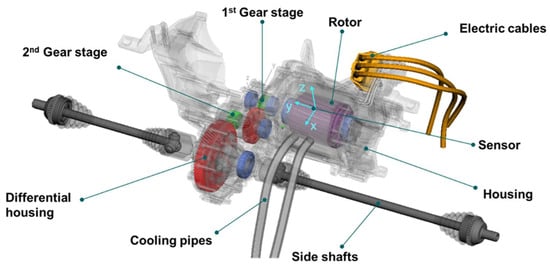 In order to study the effects of static eccentricities on the structural dynamic behavior of electrical drivetrains, a drivetrain from the ESmart BEV is considered. This drivetrain is modeled in the eMBS domain and uses a multi-domain modeling approach as described by Jaeger and Drichel et al. []. All structural components of the drivetrain, as displayed in Figure 1, are modeled as linear elastic bodies, where each individual component was first modeled using the FEM and then a modal reduction was carried out using the Craig-Bampton Method []. Linear modal damping is applied on all components by using a value of 0.02 as an estimation for aluminum and steel alloys. The gear mesh stiffness and the gear mesh excitation of the two gear stages are simulated by relying on a load-dependent Weber-Banaschek approach []. Furthermore, the non-linear characteristics of the bearings are modeled using a Hertzian contact. A viscous damping approach is used for the bearing, since it is expected that its damping will not be affected by the varying eccentricity states, which mainly affect the transfer path through the air gap of the electrical machine.