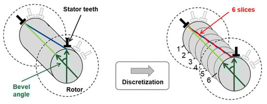 By discretization of the rotor and stator using a multi-slice modeling approach, the electrical machine is divided into six slices (see Figure 2). This enables applying electromagnetic forces on each stator tooth according to the beveled angle of the stator and the orientation of the rotor sheet metal packages [].