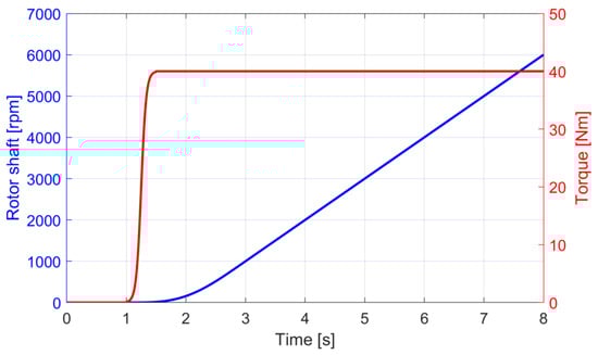 The electrical machine under consideration in this paper is a PMSM with 36 stator teeth and six pole pairs at the rotor. By combining a finite element (FE) simulation of the stator-rotor cross Section of the electrical machine with a circuit simulation by Jaeger and Drichel et al. [], the electromagnetic forces were calculated, including electromagnetic effects, such as slotting, magnetic saturation, and spatial harmonics, based on the approaches introduced by Herold et al. [,]. Various eccentricity states are incorporated in the FE simulation by modifying the air gap geometry and mesh. Based on this model, an electromagnetic force field was formed that stores the electromagnetic forces of the machine within the following five dimensions: Id-current, Iq-current, angle of rotation, eccentricity angle, and eccentricity radius. In order to apply the electromagnetic forces onto the rotor and stator of the electrical machine, a maximum torque per ampere (MTPA) look-up table is used, which stores the correlation between torque and rotation speed to Id-/Iq-current. In the displayed model, field-weakening and inverter effects, including pulse-width modulation and torque ripple, were not included, since their expected interlinking effects on the electromagnetic excitation could not be validated within this publication. Since validation of this described simulation approach with respect to measurements was already performed by Jaeger and Drichel et al. [], it can be stated that the introduced simulation is suitable for simulating the transient structural dynamic behavior of the electric drivetrain. Since the applied electromagnetic forces and the modeling approaches used for the other machine elements are highly non-linear, and the goal of this publication is to study the effects of static eccentricity state variations. For that transient run-up, simulations with a run-up duration of seven seconds are performed to ensure that all relevant system resonances are excited by the rotation speed dependent excitation frequencies of the electromagnetic excitation orders. This is performed by applying the maximum torque onto the electric drivetrain and the steadily increasing the rotation speed of the electrical machine (see Figure 3). In order to ensure higher numerical stability during the transient run-up simulation, the torque is applied before the rotation speed is increased. While the rotation speeds increase up to 6500 rpm, the applied torque remains constant. Based on the simulation results of the transient run-up simulation, the critical operation point and dominant excitation orders can be identified, which is needed to perform a targeted optimization in the following Sections.