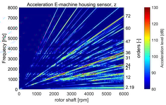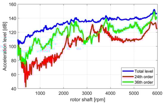 By comparing the total level of acceleration with the most dominant order levels, which are the 24th and 36th, it can be seen, that the excitation of the electrical machine contributes significantly to the acceleration levels, especially at rotation speeds above 2100 rpm (see Figure 5). The total level of acceleration represents the logarithmic sum of all spectral acceleration components (displayed in Figure 4) within the frequency range of 0 Hz to 8000 Hz without any weighting or filtering. In comparison to Figure 4, it can be stated that especially the 36th order of the electrical machine, which is both an excitation order of the stator teeth and of the pole pairs, is causing the highest acceleration level during the run-up. This critical operation point occurs at 5800 rpm and 152 dB and will be investigated in the following Sections.