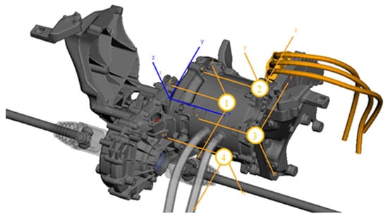 eMBS drivetrain sensor positions (orange) with respect to the global coordinate system (blue).