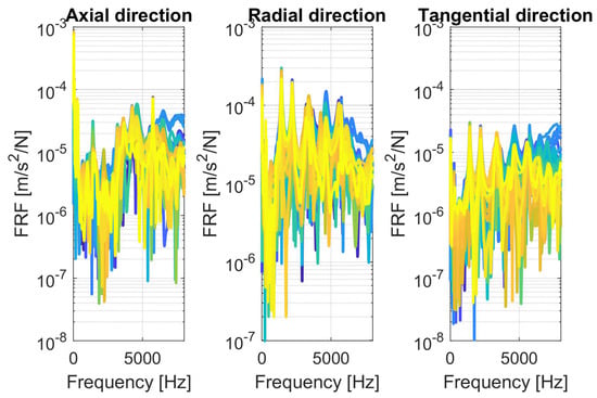 FRF for axial, radial, and tangential direction of all stator teeth at sensor 1 (stator teeth 1: blue → stator teeth 36: yellow).