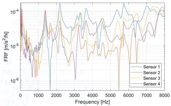 The averaged FRF reveals that Sensor 1 and Sensor 3 exhibit increased FRF amplitudes in comparison to Sensor 2 and Sensor 4 (see Figure 9). The averaging of the FRFs also indicates which resonances are primarily excited by the electromagnetic forces.