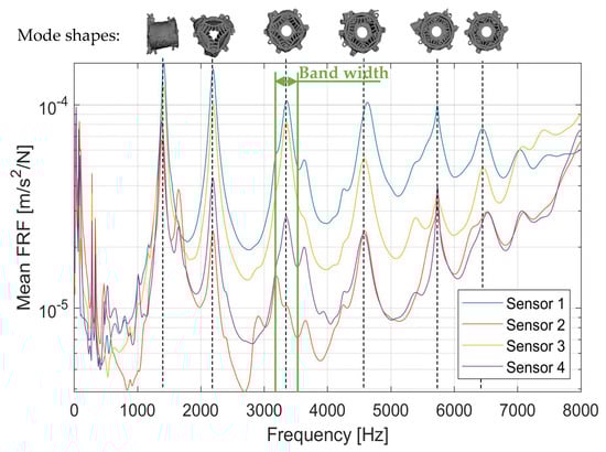 When displaying the FRF from the excitation from one representative tooth, distinct resonances are seen over the whole frequency spectrum (see Figure 8). Resonances become visible at all four FRFs of the sensors, for example, at 1500 Hz, 2200 Hz, and 5600 Hz. However, there are also resonances where only three out of four sensors, or fewer, show elevated amplitudes, such as at 1700 Hz, 3100 Hz, or 3600 Hz. Assuming a symmetric radial force distribution for the still concentric force pattern, it is suitable to derive an averaged FRF across all applied stator teeth excitations for each sensor. This enables the identification of resonances that are excited the most by the electromagnetic excitations. Since these dominant resonances cause the critical operation points, as were identified in Section 3, reducing their excitability will lead to a decrease in acceleration amplitude.